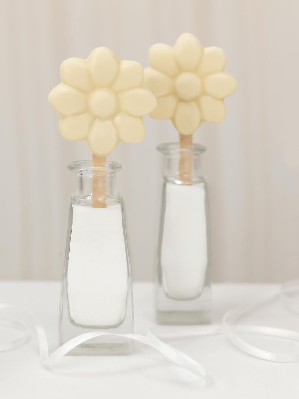 Die außergewöhnlichen Lollis haben wir mit Blüten verziert. Ihr könnt sie aber auch nach Lust und Laune mit essbarem Glitzer, Buchstaben und Zuckerelementen immer wieder neu dekorieren.