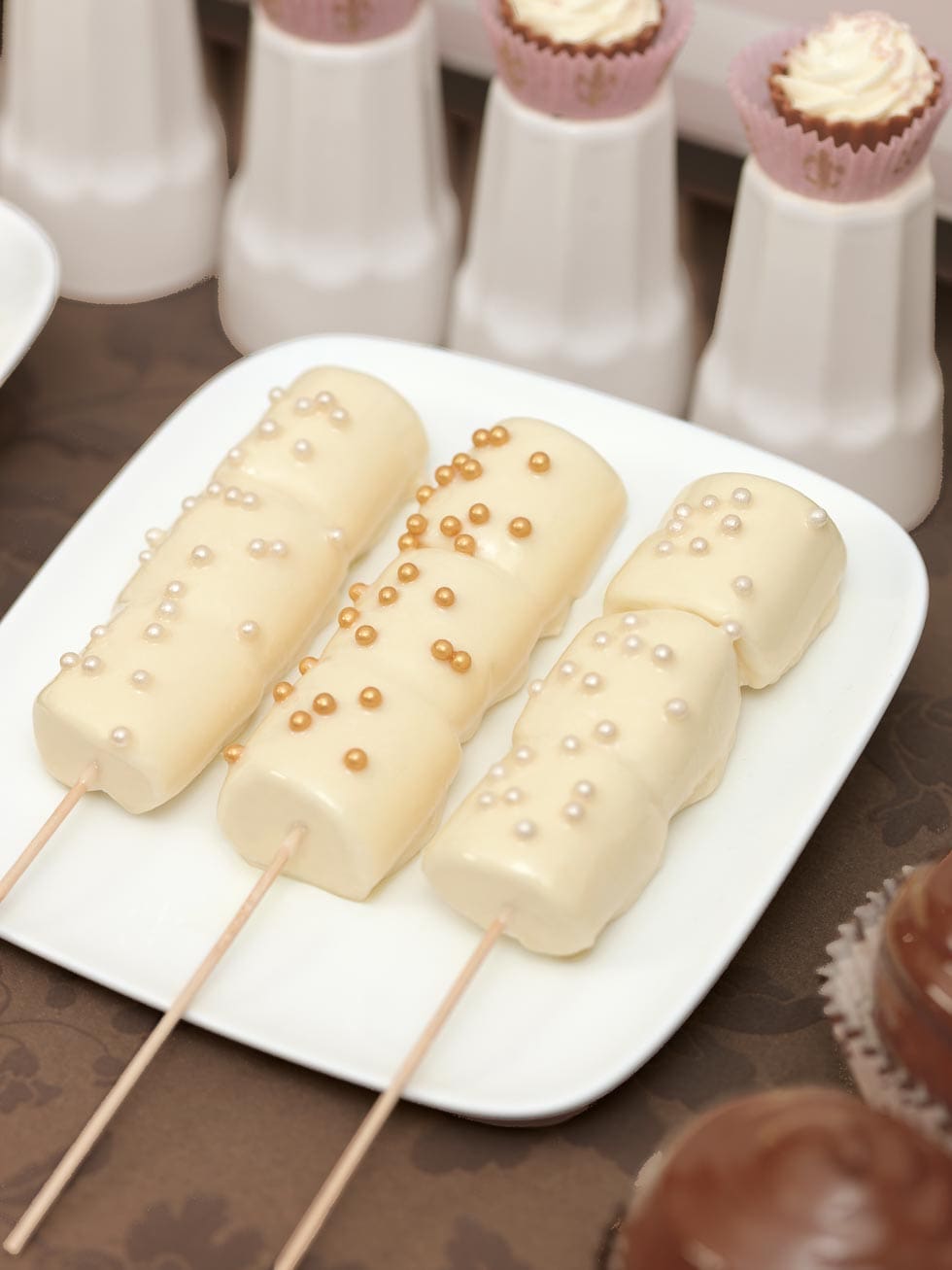 Pimpt die Schaumhappen ganz einfach, indem ihr sie aufspießt und mit weißer Schokolade überzieht. Zum Schluss streut ihr noch ein paar Zuckerperlen darauf und werdet überrascht sein: Das geht nicht nur unglaublich schnell und sieht toll aus, sondern schmeckt auch gigantisch lecker!