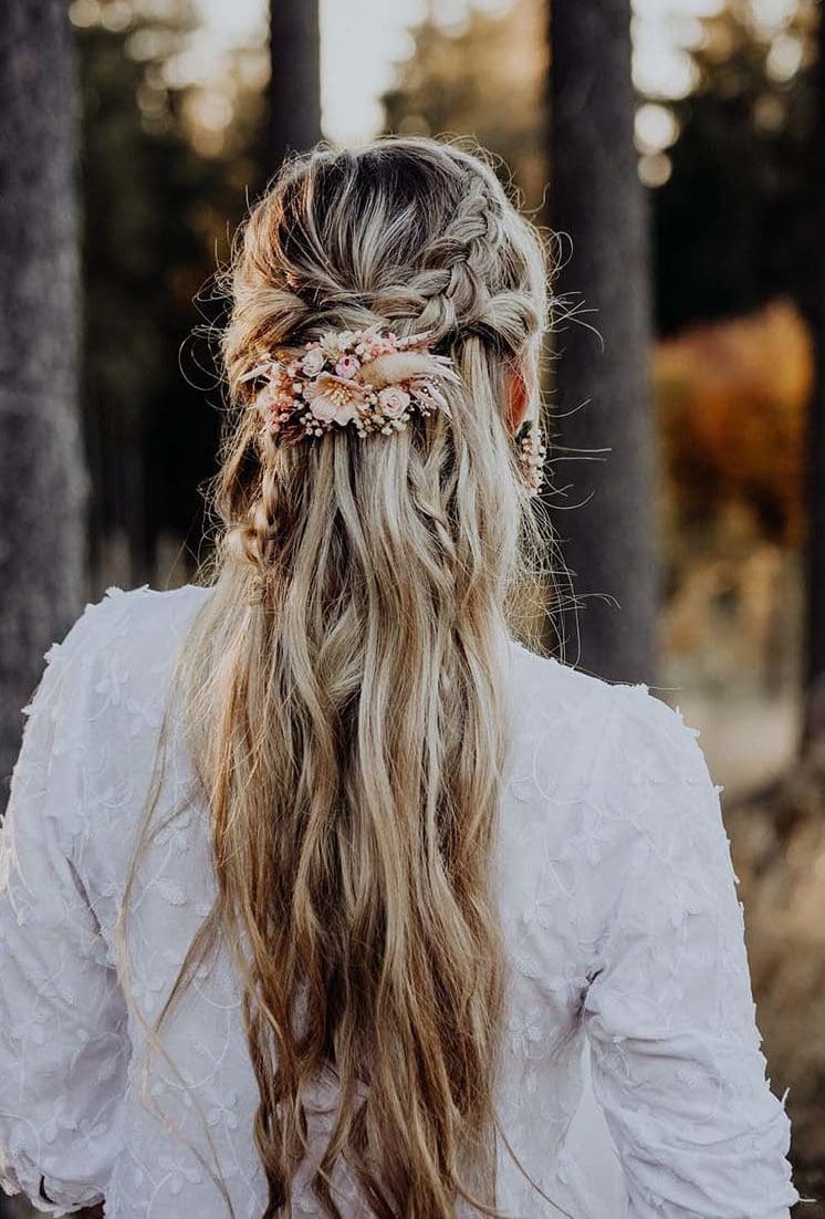 Haarkämme mit Blüten verleihen der Brautfrisur einen Hauch von Frische und Natürlichkeit, weshalb sie perfekt für einen romantischen Vintage Brautstil geeignet sind. Darüber hinaus können sie mit gebleichtem Farn und Gräsern aber auch im Boho-Look gestylt werden. Hier müsst ihr lediglich darauf achten, dass die floralen Elemente möglichst natürlich wirken.
