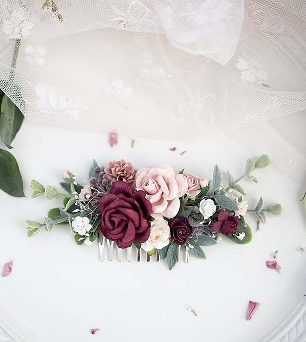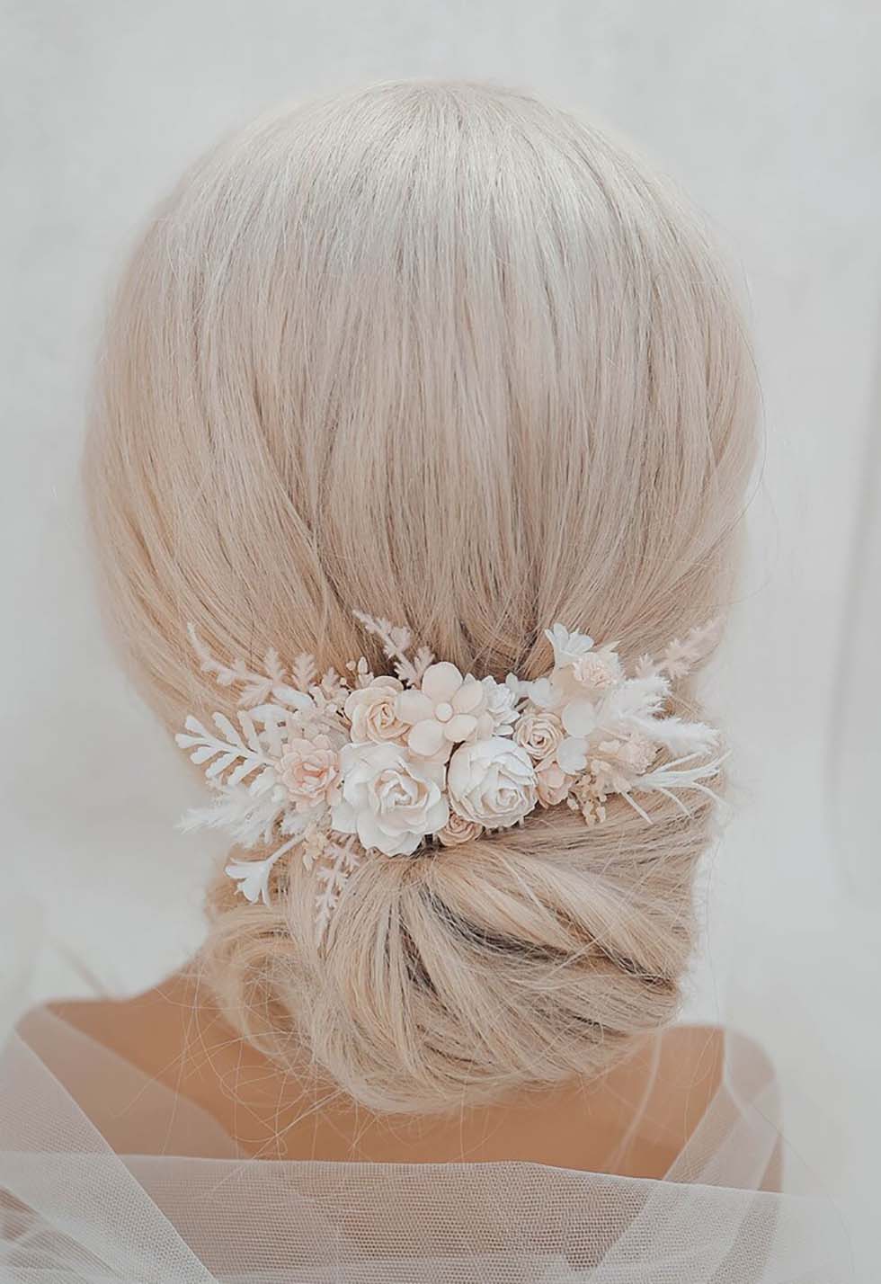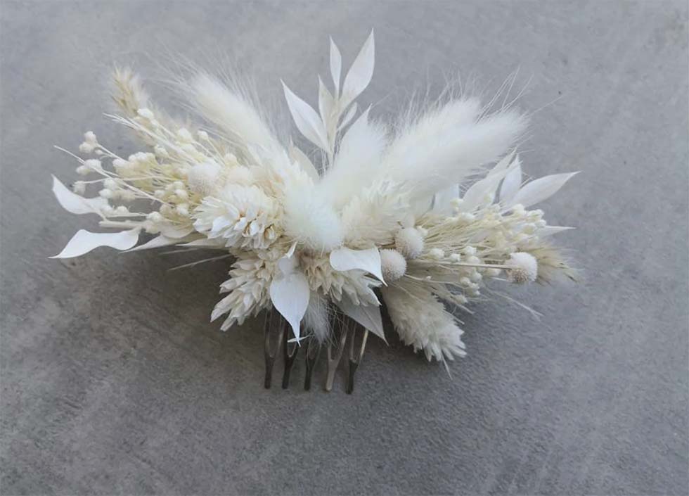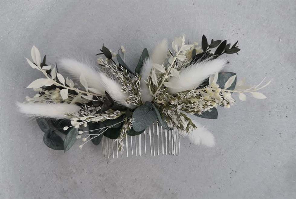 Für den modernen Boho-Look oder die Greenery-Hochzeit bieten sich Haarkämme mit Trockenblumen an, die in verschiedensten Ausführen und Farben erhältlich sind.