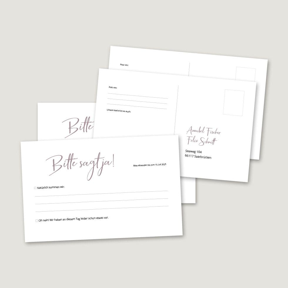 Mit unserem Hochzeitskarten Set erhaltet ihr das große Wunschlos-Glücklich-Paket mit allen Elementen, die ihr für eure Hochzeit benötigt:Von der Einladung über Accessoires für die Trauung und Feier bis hin zu den Dankeskarten ist alles beinhaltet.