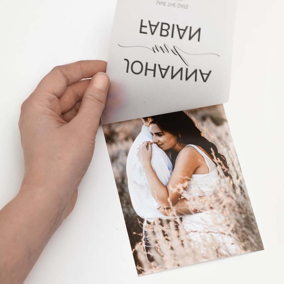 Zum Beispiel könnt ihr eine Klappkarte mit Einleger-Karte drucken lassen und dafür einen individuellen Umschlag auf Transparentpapier – mit eurem individuellen Design.