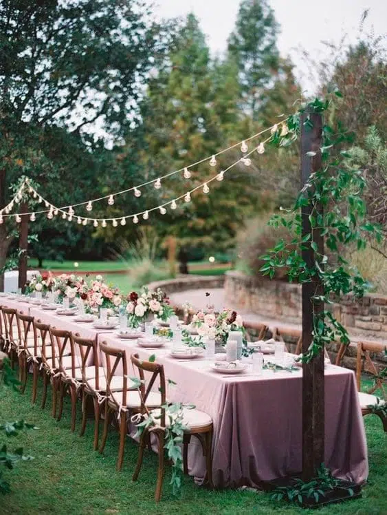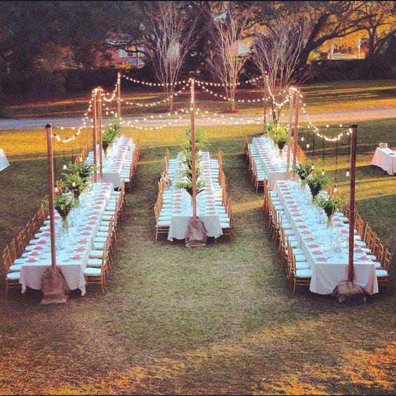 Schön ist es auf jeden Fall, wenn der Festort von Lichterketten eingesäumt wird oder ihr einen Lichtertunnel über einer langen Tafel installiert. In die Wiese könnt ihr aber auch ganz großartig Stäbe in den Boden stecken und daran Wimpelgirlanden befestigen.
