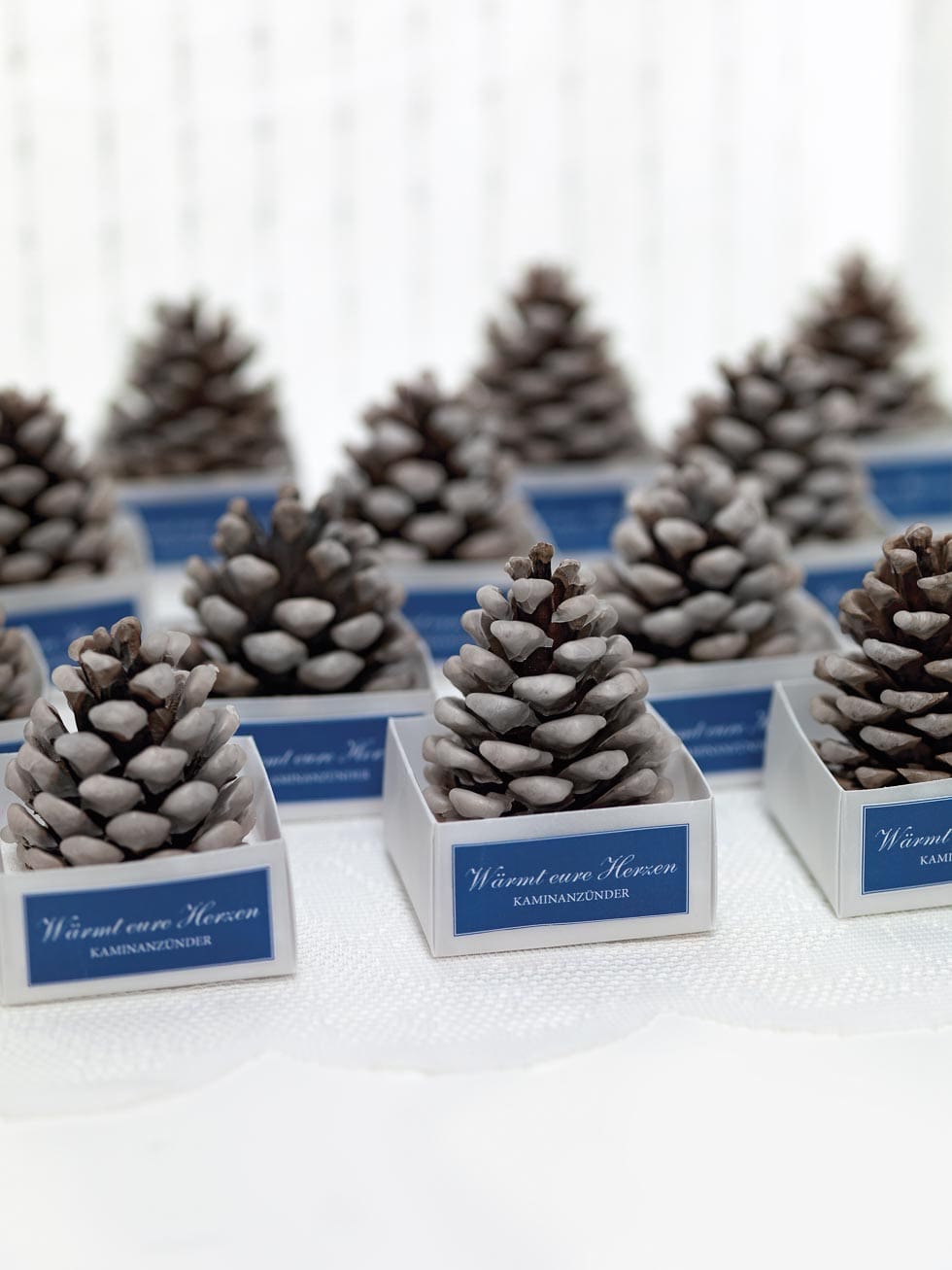 Die Platzkarten könnten Sie an selbst gesammelten Tannenzapfen befestigen und entweder auf einem Tisch in reih und Glied aufstellen oder als zusätzliche Dekoration in den Eingangsbereich hängen.