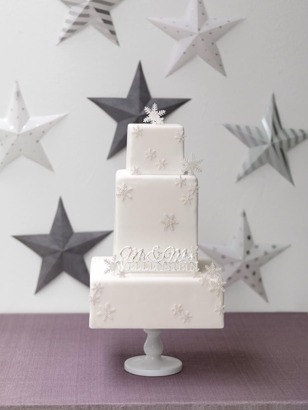 Hochzeitstorte mit Schneesternen und Schriftzug Mr. & Mrs.