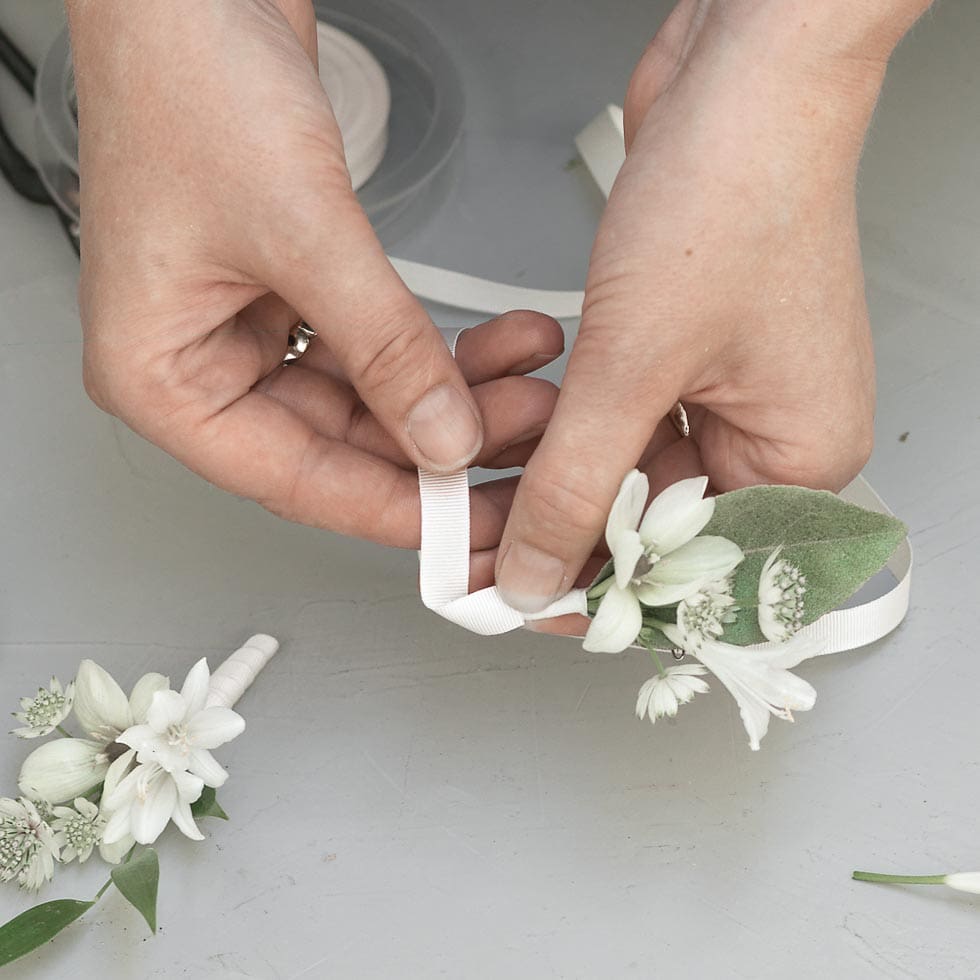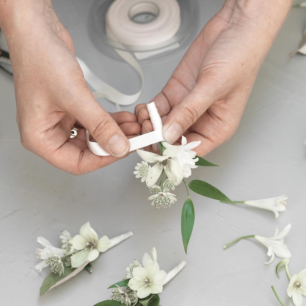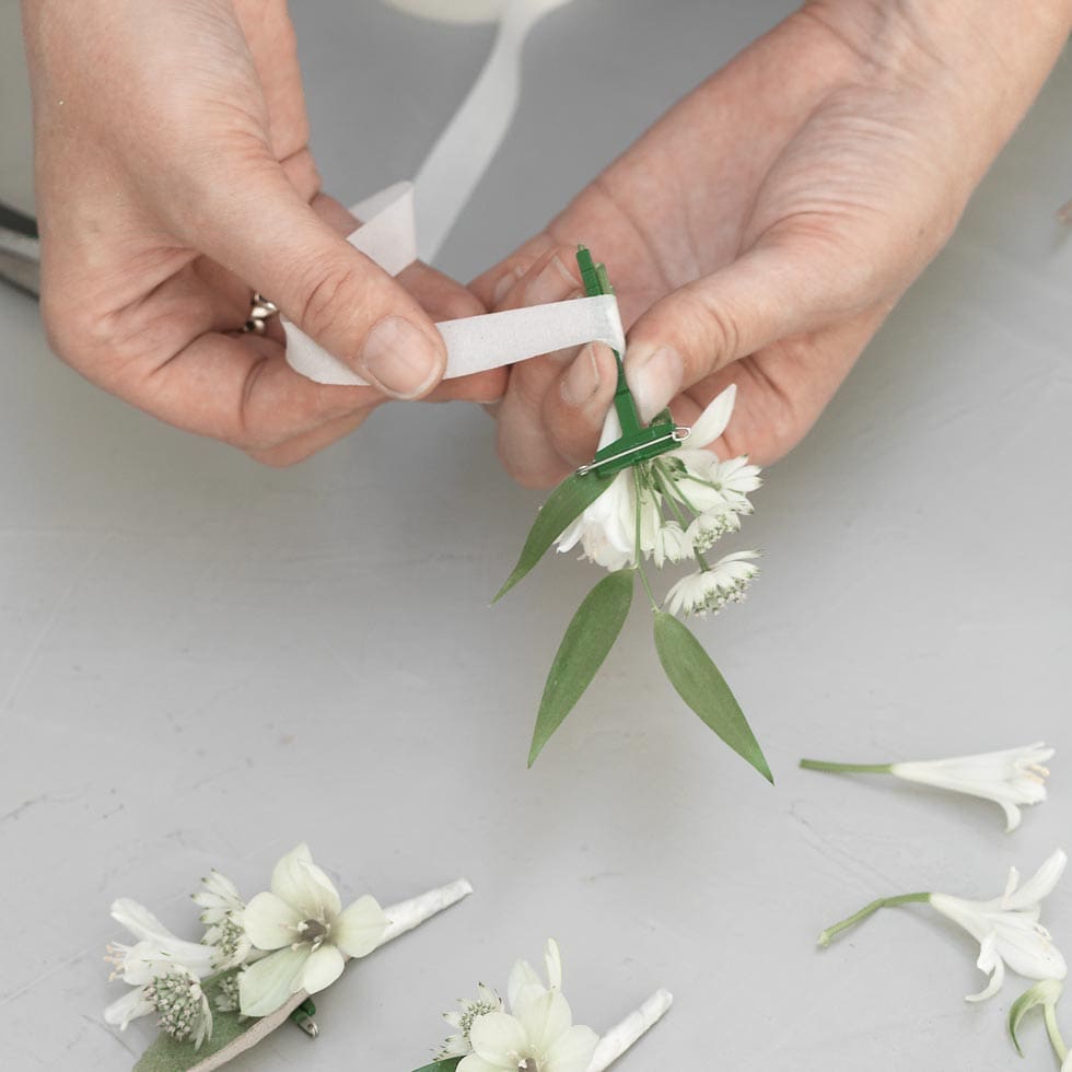 Die Blütenstiele werden unten wird wie beim Brautstrauß mit einem Schleifenband versehen. Optional können auch Perlen oder weitere Elemente ergänzt werden, um den Blumenanstecker noch persönlicher zu gestalten.
