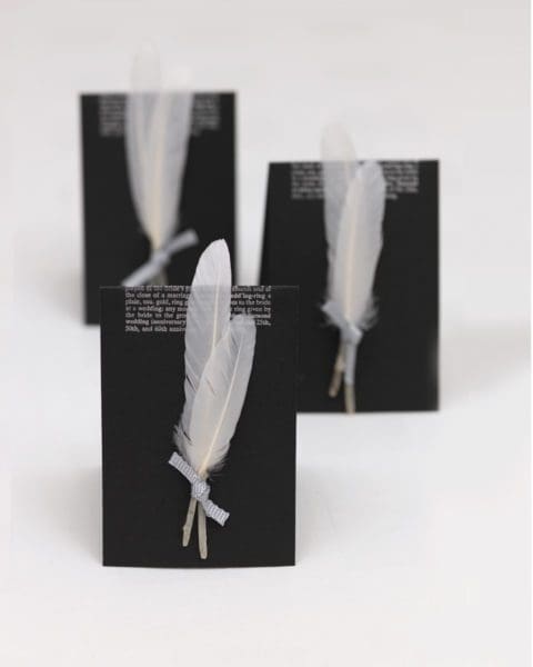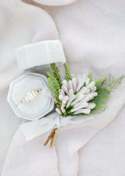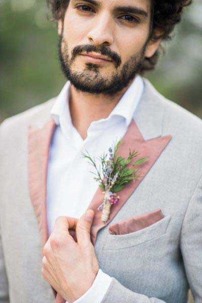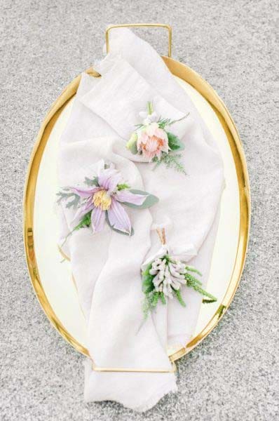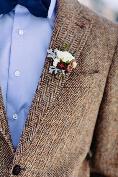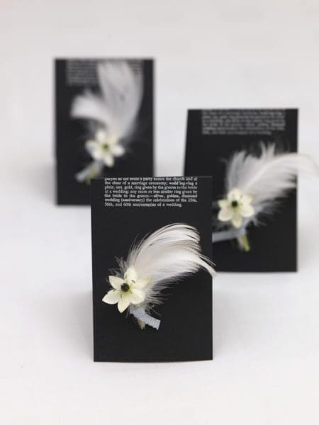 Darüber hinaus könnt ihr euer Boutonniere auch ganz ohne Blumen mit Federn und weiteren Accessoires ergänzen, die noch lange nach der Hochzeit eine schöne Erinnerung sind und am Revers getragen werden können.