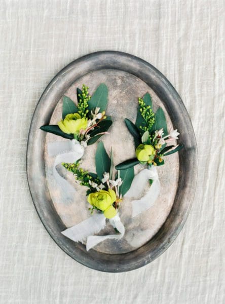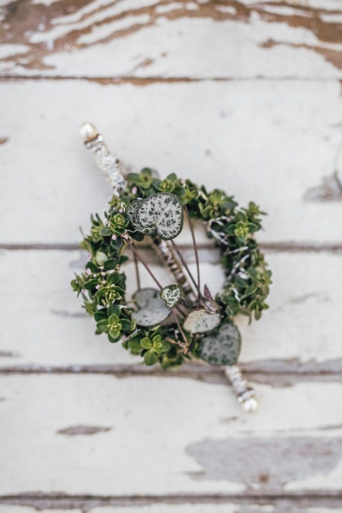 Alternativ könnt ihr eure Anstecker auch mit frischen Blumen gestalten, die sich auch im Brautstrauß und der gesamten Hochzeit wiederfinden.