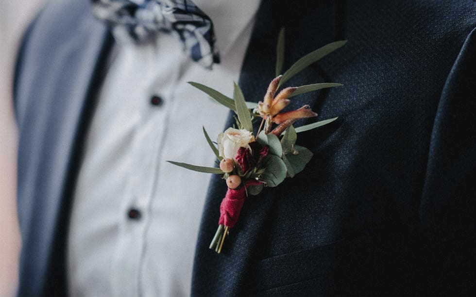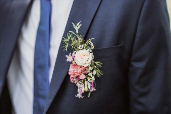 Der Reversschmuck gibt nicht nur den Bräutigam, sondern auch ganz besondere Gäste bei der Hochzeit ein besonderes Augenmerk, weshalb der Blumenanstecker ein so schönes Detail mit großer Bedeutung ist.