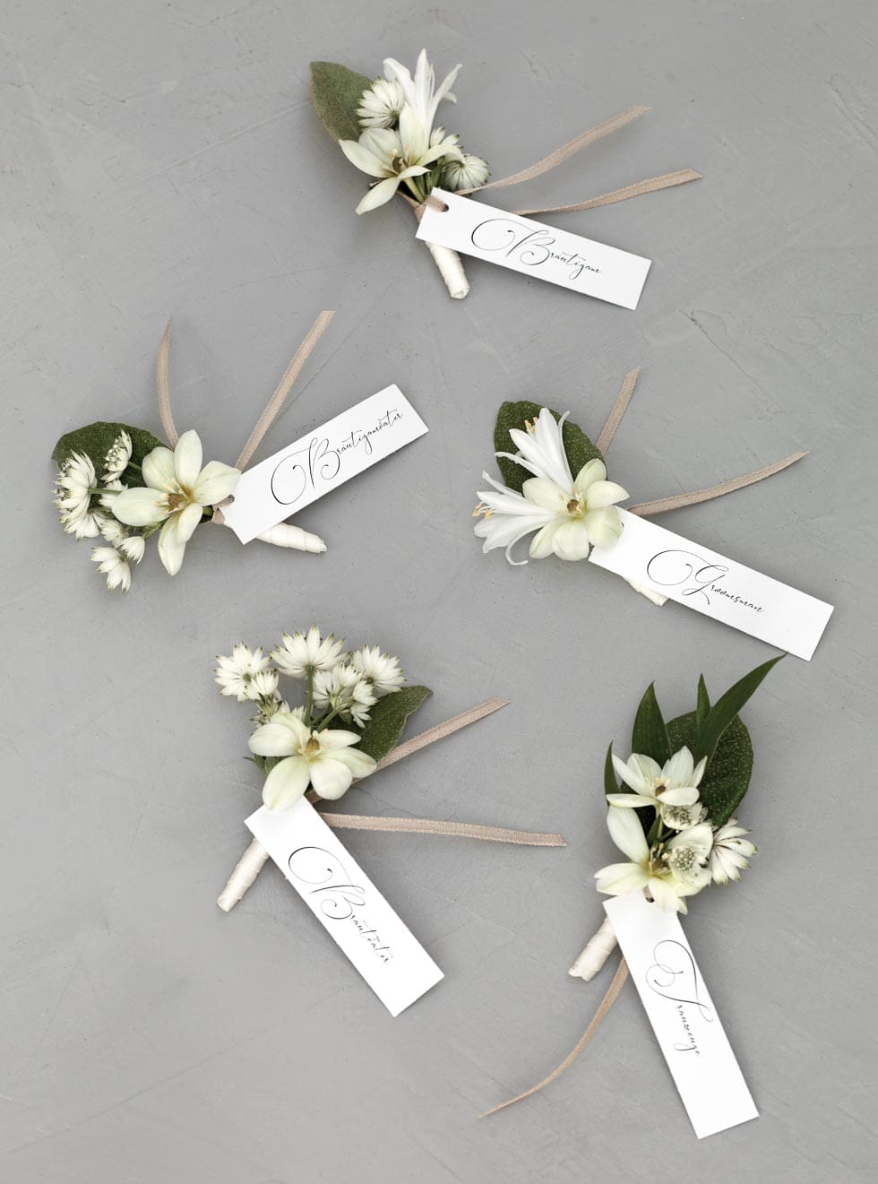 Hier gibt es keine wirkliche Regel. Denn es kommt eigentlich nur auf die Breite des Revers an und wie auffällig das Boutonniere (im Knopfloch des Revers getragene Blüte) sein soll. Und da ihr dies bei den Gästen nicht planen könnt, bietet es sich an, dass die Anstecker für die Gäste etwas kleiner gestaltet werden.