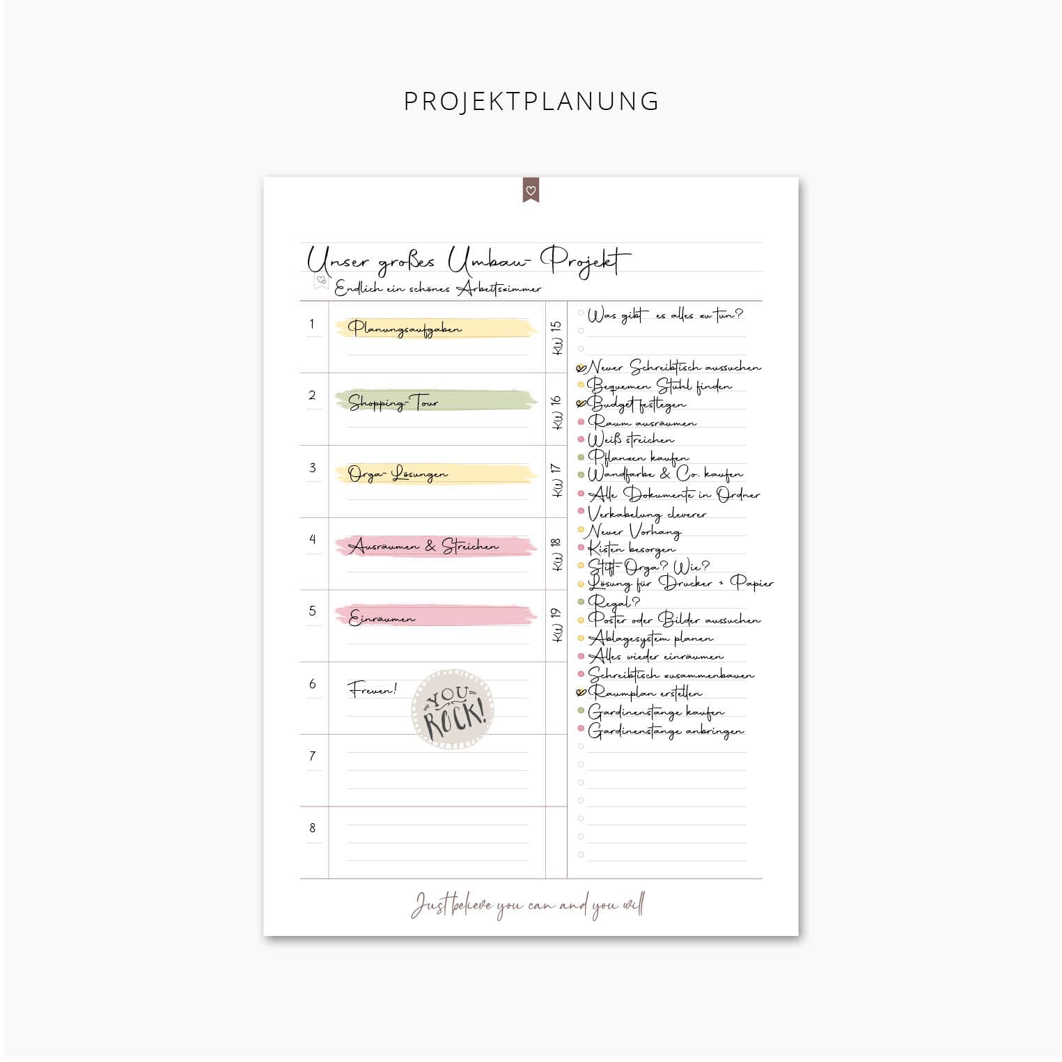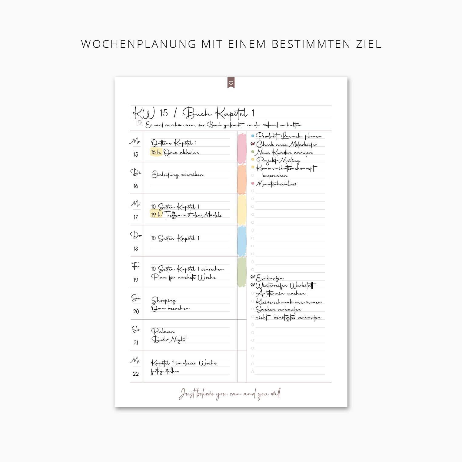 Nehmen wir an, euer großes Ziel ist ein bestimmtes Herzensprojekt oder ein Abschnitt davon, an dem ihr in dieser Woche arbeiten möchtet, um es abzuschließen oder dem Ziel ein bisschen näher zu kommen.