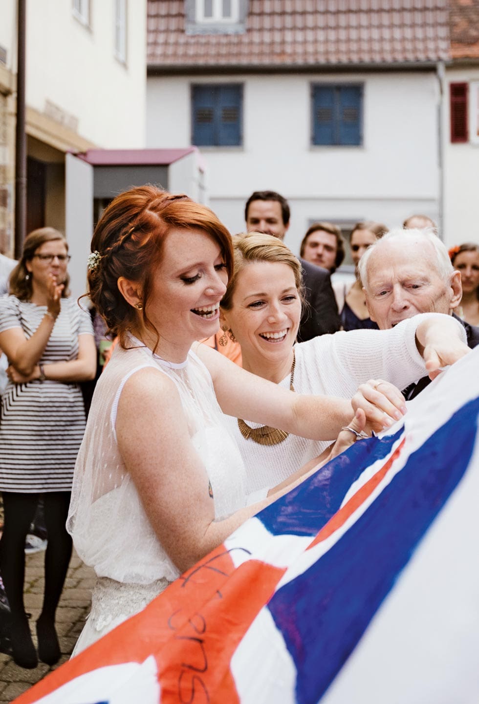 Vor der Tür wurden die beiden mit einer britischen Flagge in Herzform als Überraschung empfangen. Ein kleines bisschen Tradition, die aber außergewöhnlich schön umgesetzt wurde.