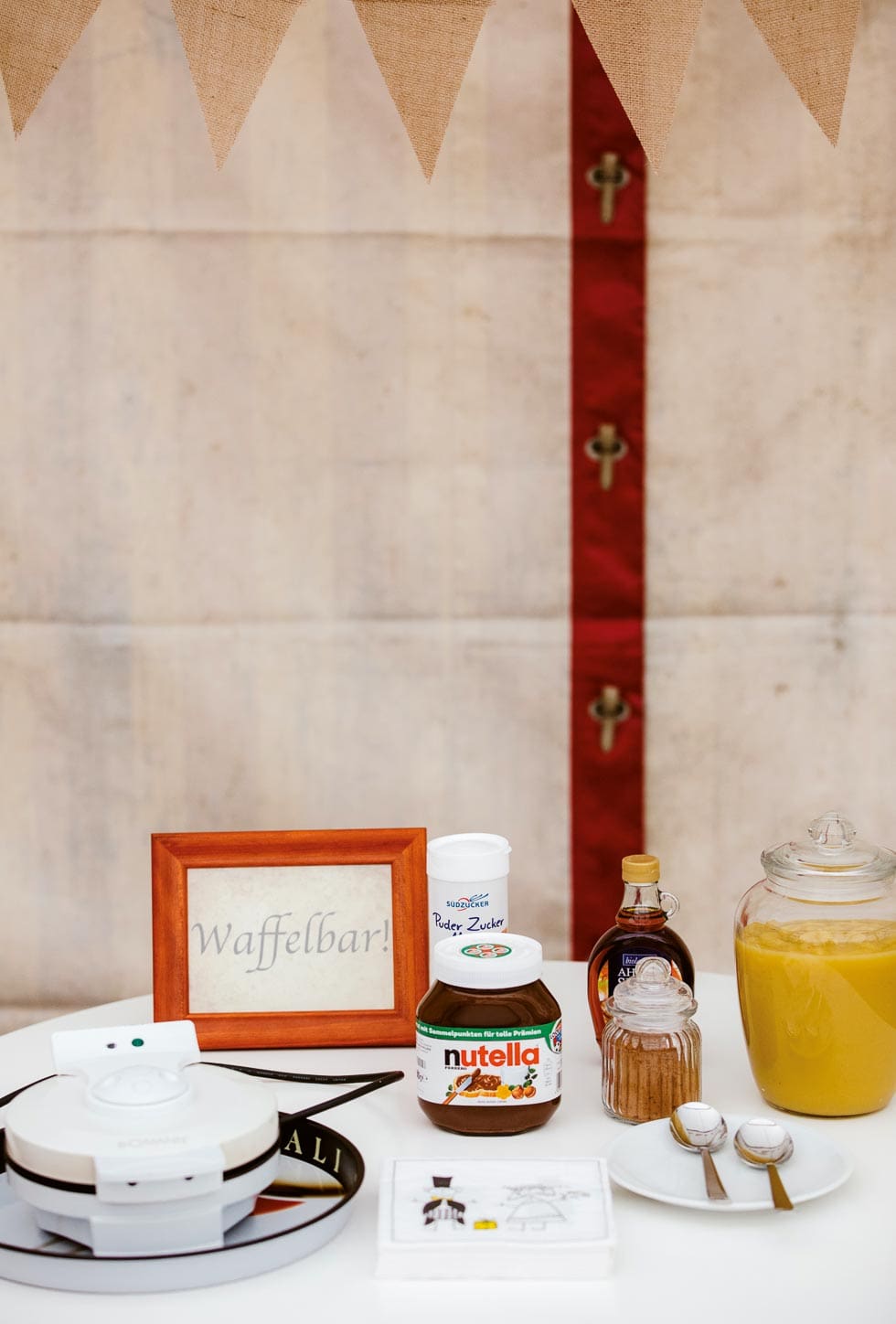 Und statt sich um die perfekten Gefäße für die Gestaltung der Waffelbar zu sorgen, wurden die Toppings ganz einfach neben das Waffeleisen gestellt. Jeder konnte sich bedienen und niemand hat etwas vermisst.