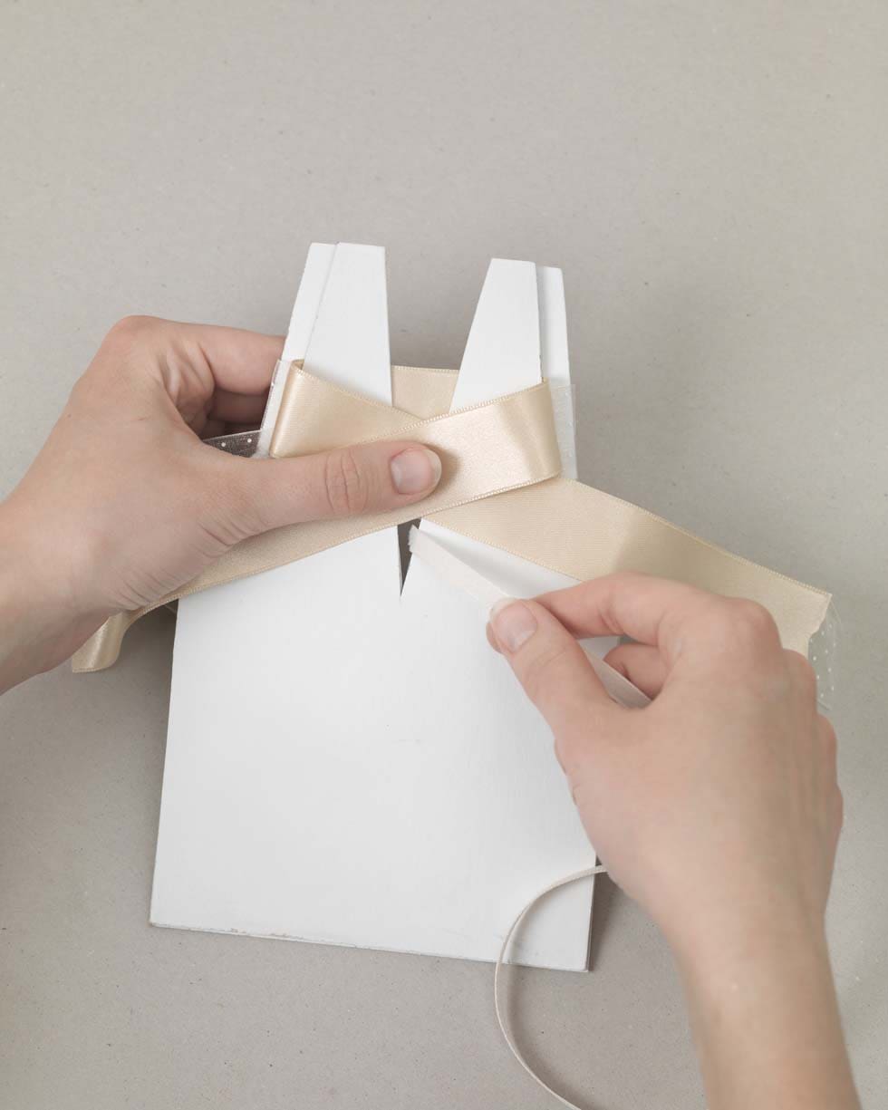Dreht die Vorlage um und macht mit dem dünnen Schleifenband einen Doppelknoten.