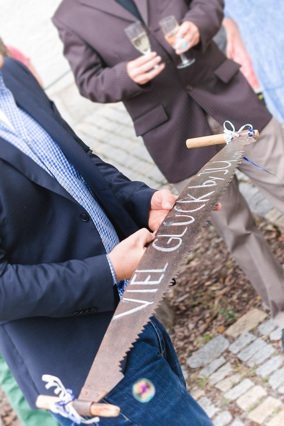 Scherzkekse geben dem Brautpaar eine extra stumpfe Säge oder einen dicken, trockenen Stamm und freuen sich, wenn das Brautpaar so richtig ins Schwitzen kommt. Das ist nicht Sinn und Zweck dieses Brauches.