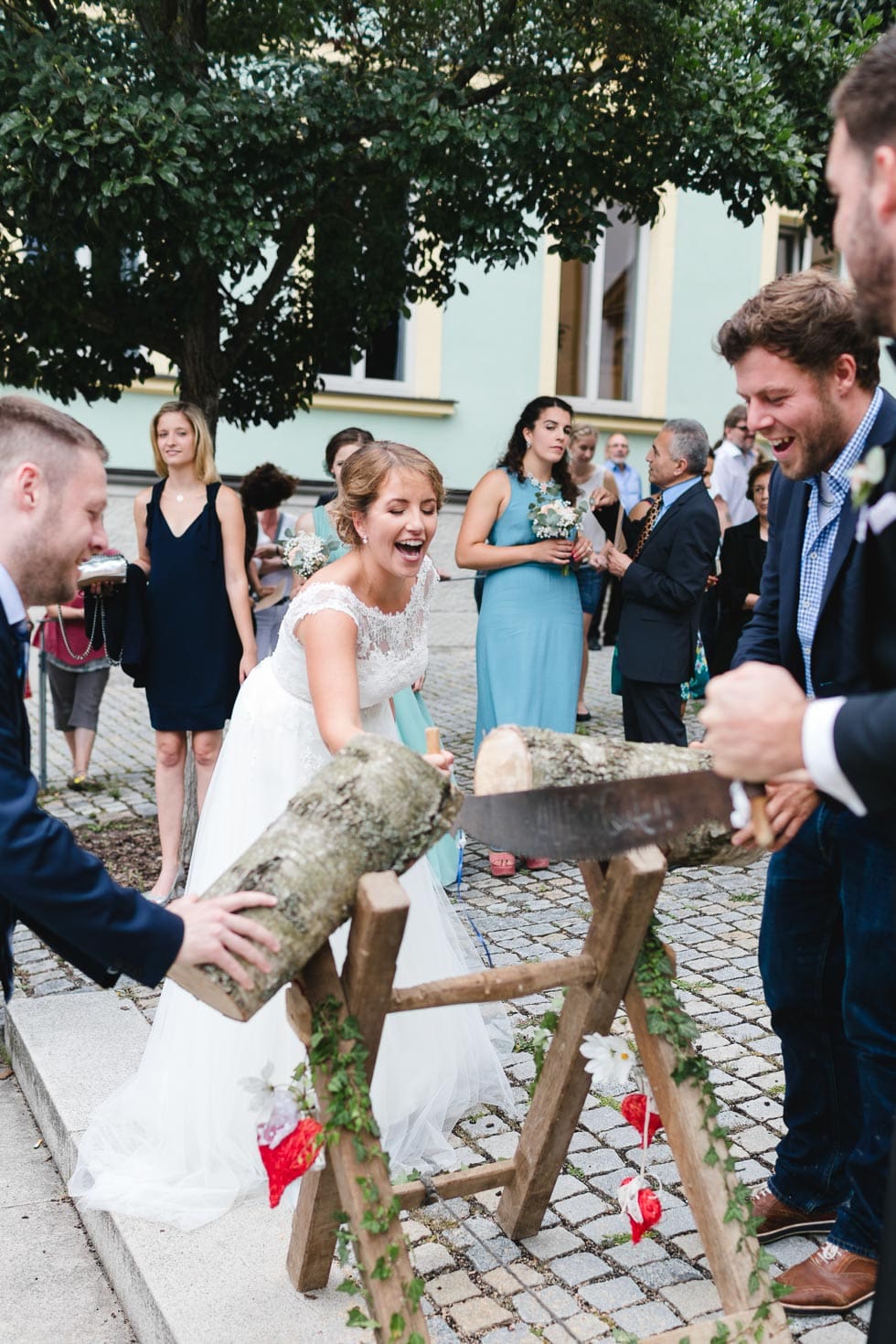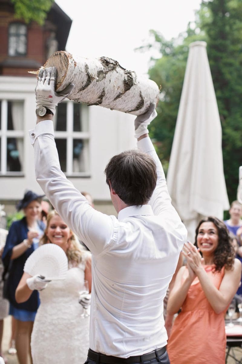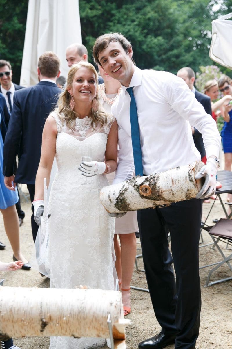 Versammelt alle Gäste um den Baumstamm, damit sie das Brautpaar anfeuern und motivieren können und daraus eine wunderbare Aktion zur Hochzeit wird. Die große Freude nach der erldigten Arbeit wird von allen gefeiert.