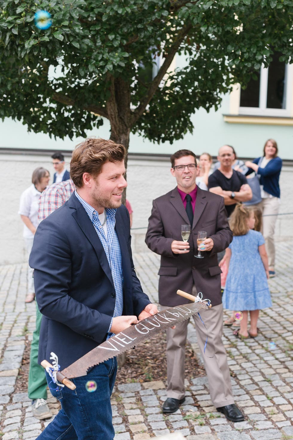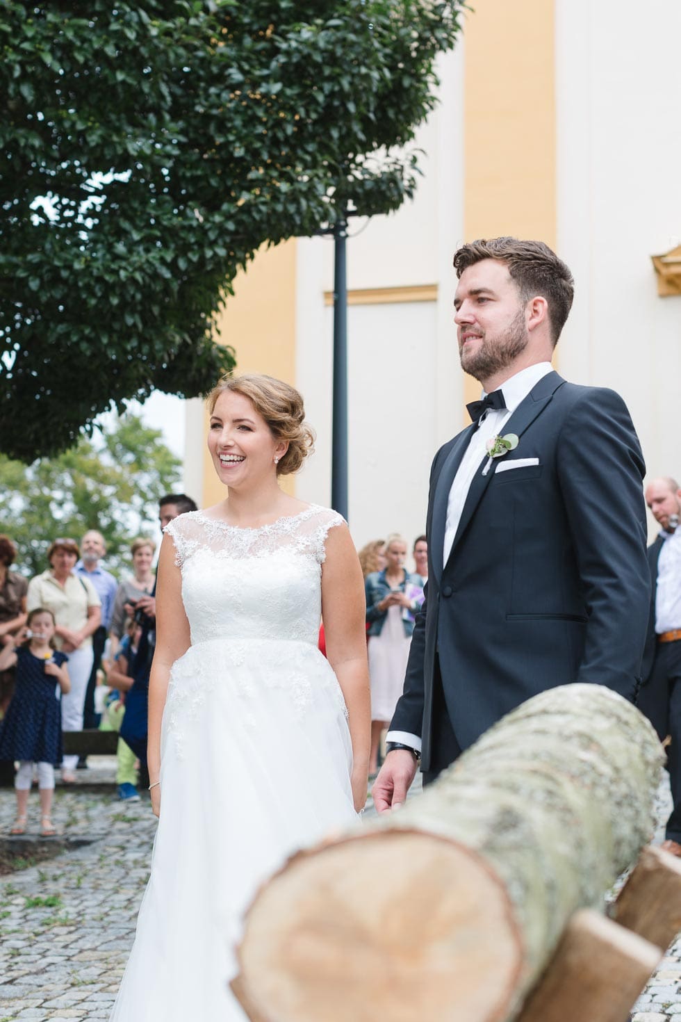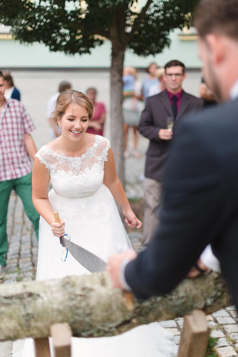 Versammelt alle Gäste um den Baumstamm, damit sie das Brautpaar anfeuern und motivieren können und daraus eine wunderbare Aktion zur Hochzeit wird. Die große Freude nach der erldigten Arbeit wird von allen gefeiert.