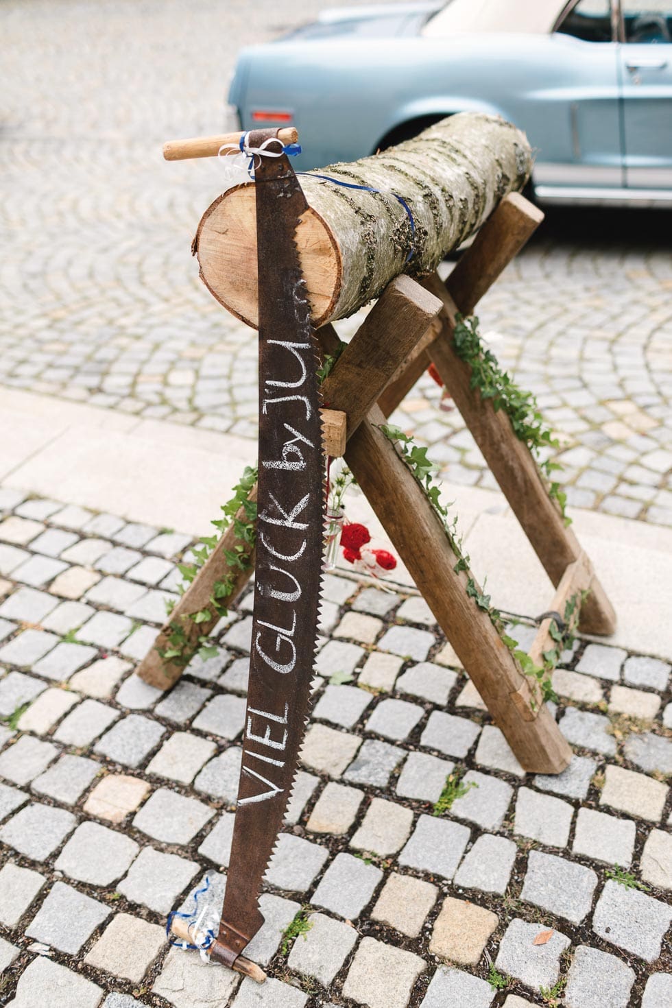Verziert den Sägebock mit Blattgrün, wie zum Beispiel Eukalyptus, Klematis-Ranken oder bindet kleine Blumengestecke daran. Schön ist es aber auch das Holz zu streichen und die Namen des Brautpaars auf den Mittelbalken zu schreiben.