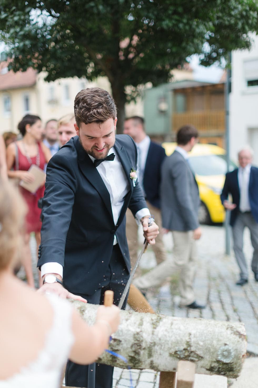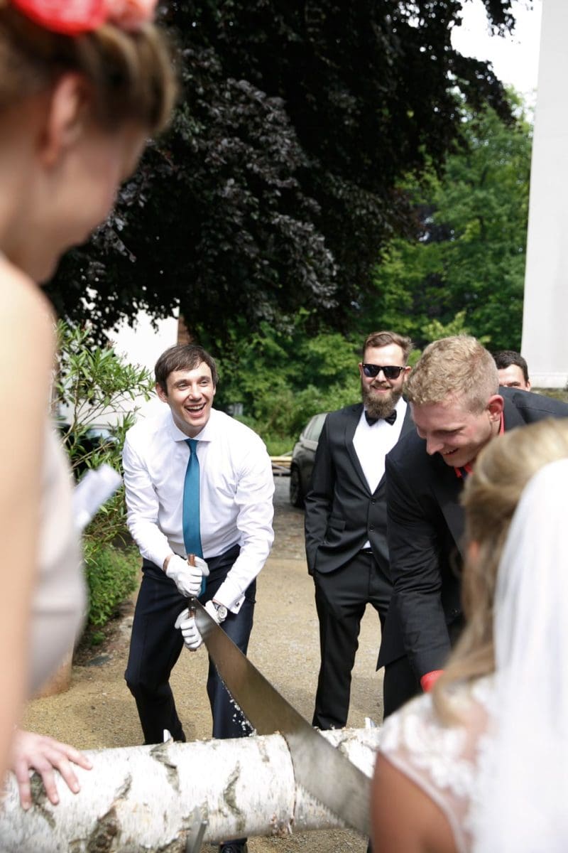 Solltet ihr es mit der Dicke des Stammes übertrieben haben, mobilisiert die Trauzeugen, dem Brautpaar jetzt beizustehen und für sie ein paar kräftige Züge auf dem Weg zum Glück zu machen oder zumindest mit anzupacken.