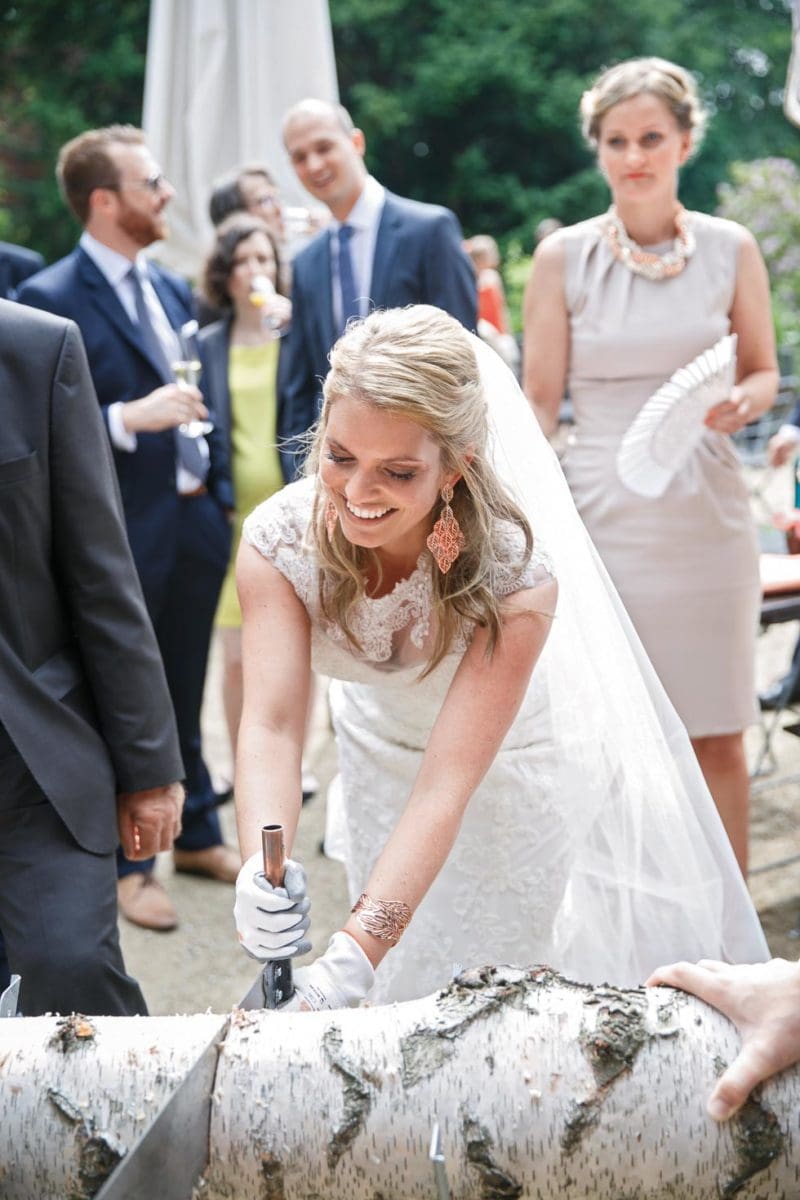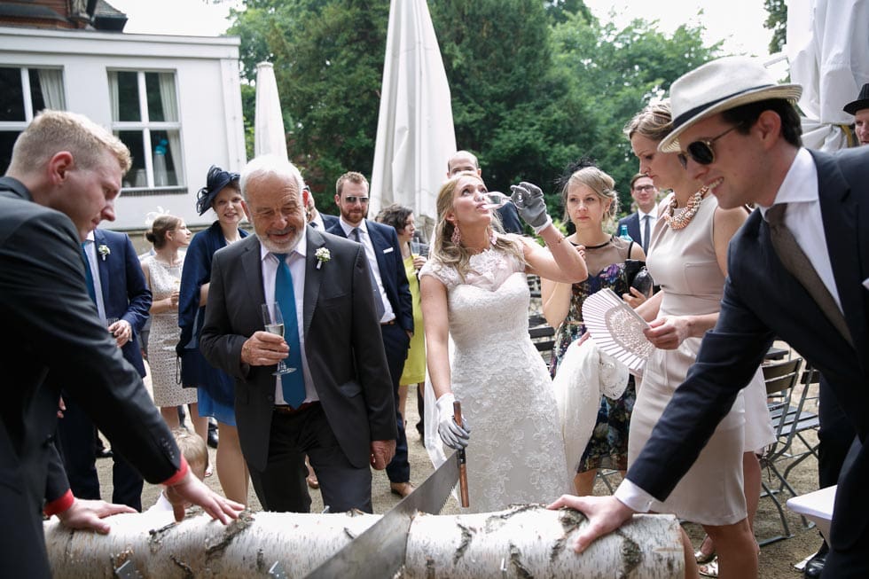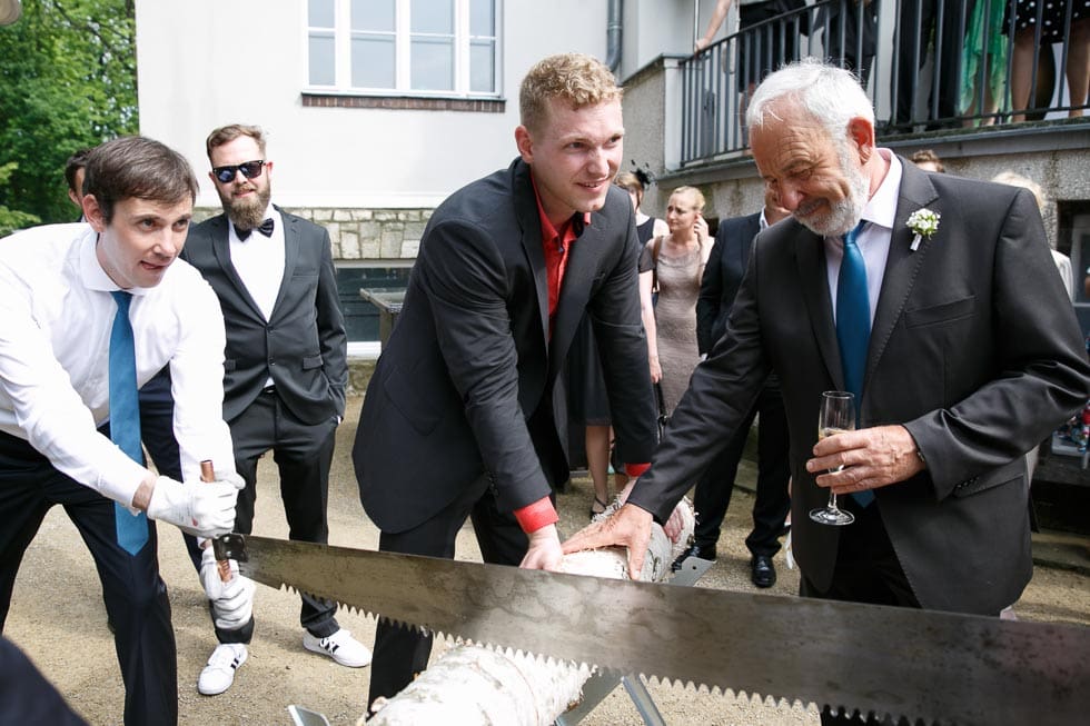 Das Baumstamm-Sägen findet meist nach den Glückwünschen im Anschluss an die Trauung im Außenbereich des Trauortes statt. So wird das Baumstamm Sägen zur ersten Ehehürde, die das Paar nehmen muss, bevor gefeiert werden darf.