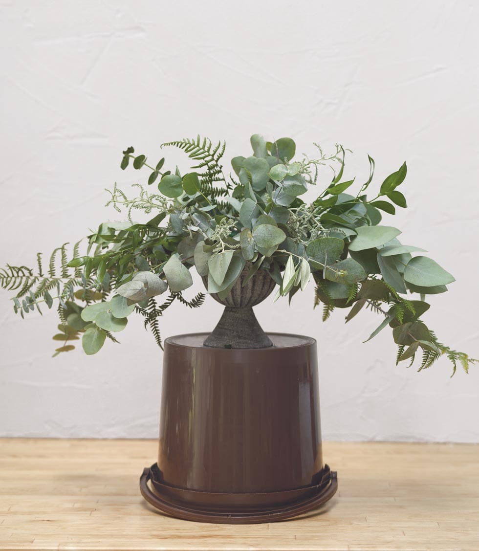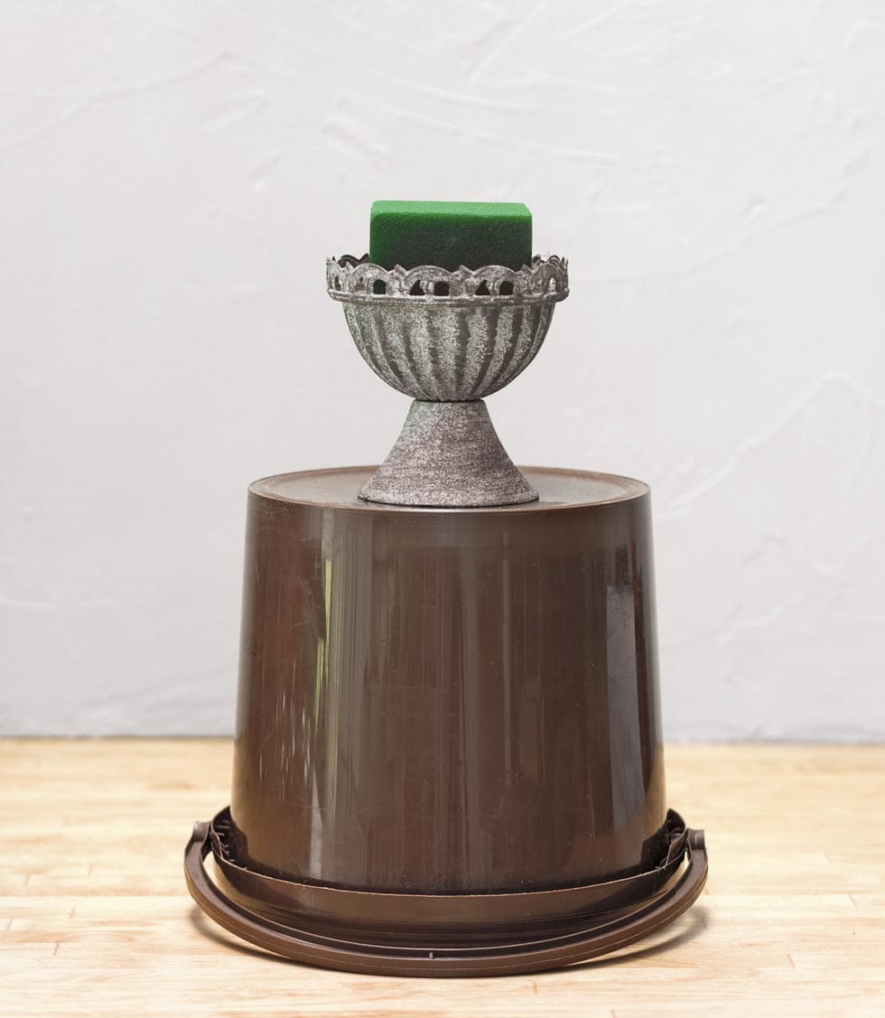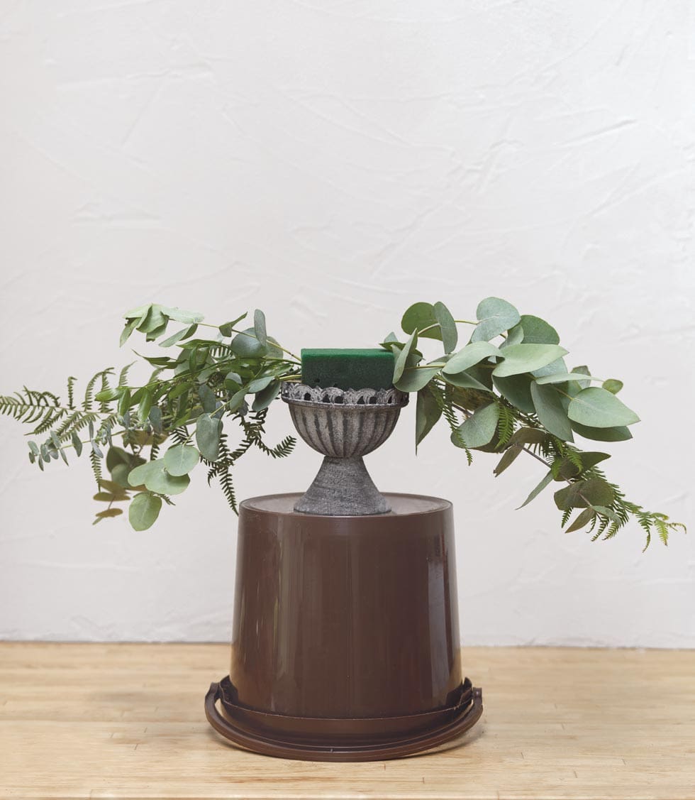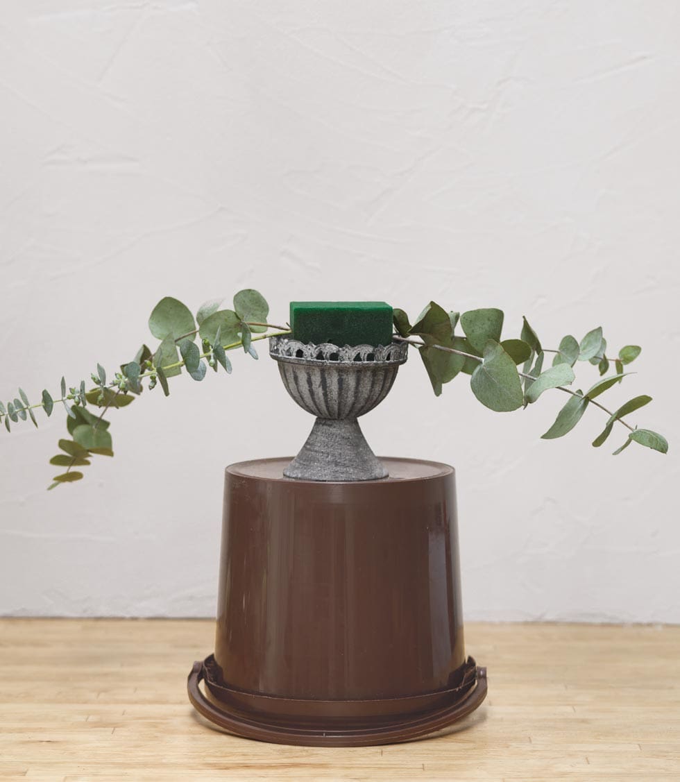 Stellt euer Gefäß auf einen Sockel wie zum Beispiel einen umgedrehten Eimer. So könnt ihr einfacher am Gesteck arbeiten und die Äste abfließend zu arrangieren.