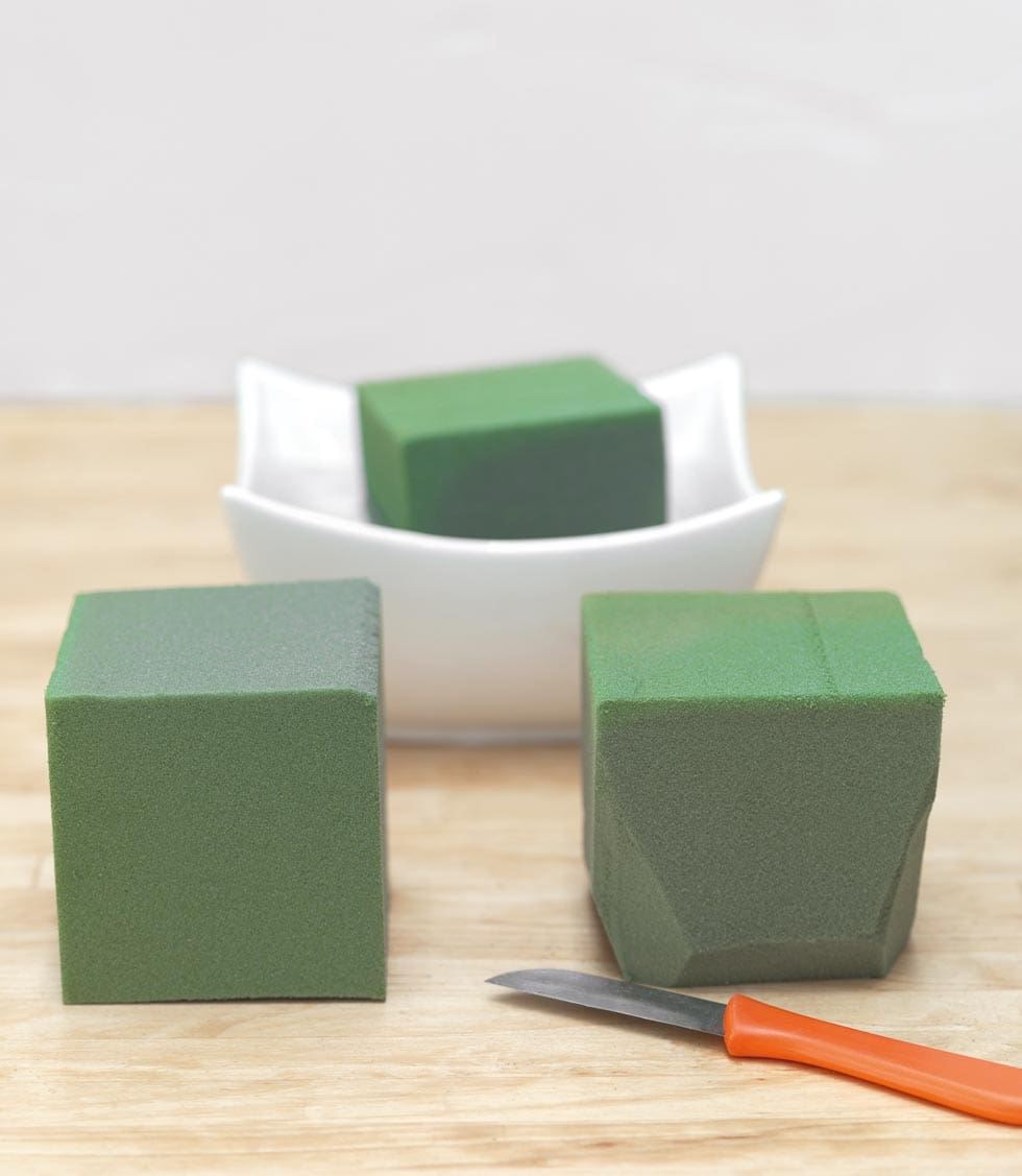 Schneidet die Steckmasse so groß zurecht, dass sie über das Gefäß herausragt und den Boden komplett abdeckt.