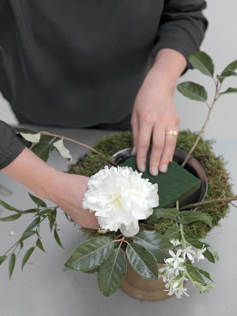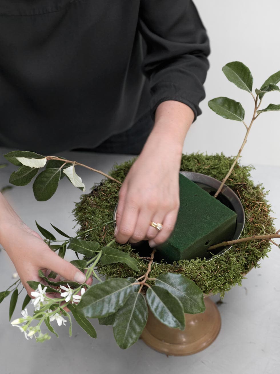 Falls euer ausgewähltes Gefäß nicht dicht ist, könnt ihr dies unproblematisch lösen, indem ihr eine Schüssel hineinstellt und diese als Behälter für die Feuchtsteckmasse verwendet. Ihr Rand wird dann einfach wie hier gezeigt in einem Moosbett versteckt. So könnt ihr auch prima eventuelle Größendifferenzen ausgleichen.