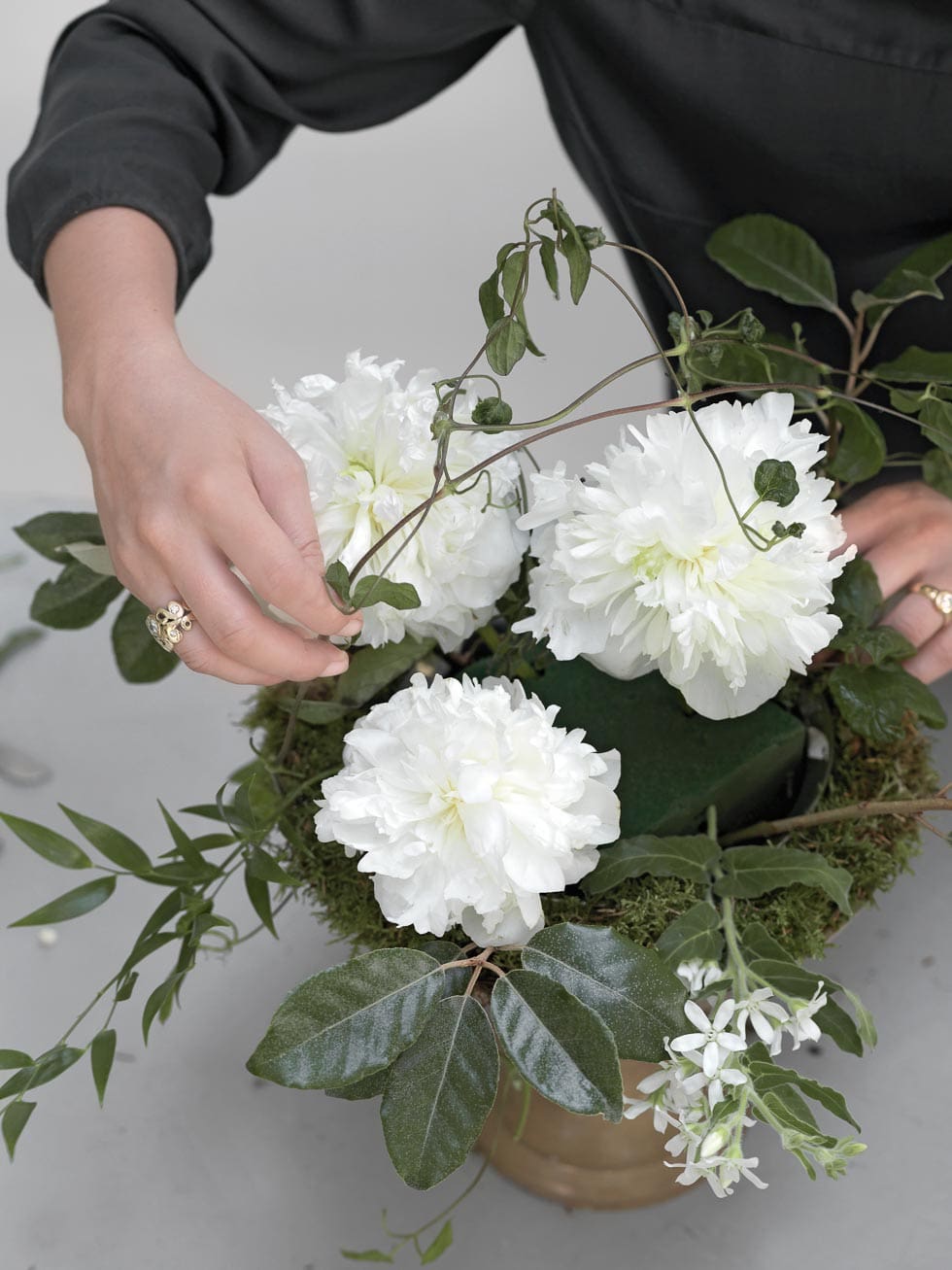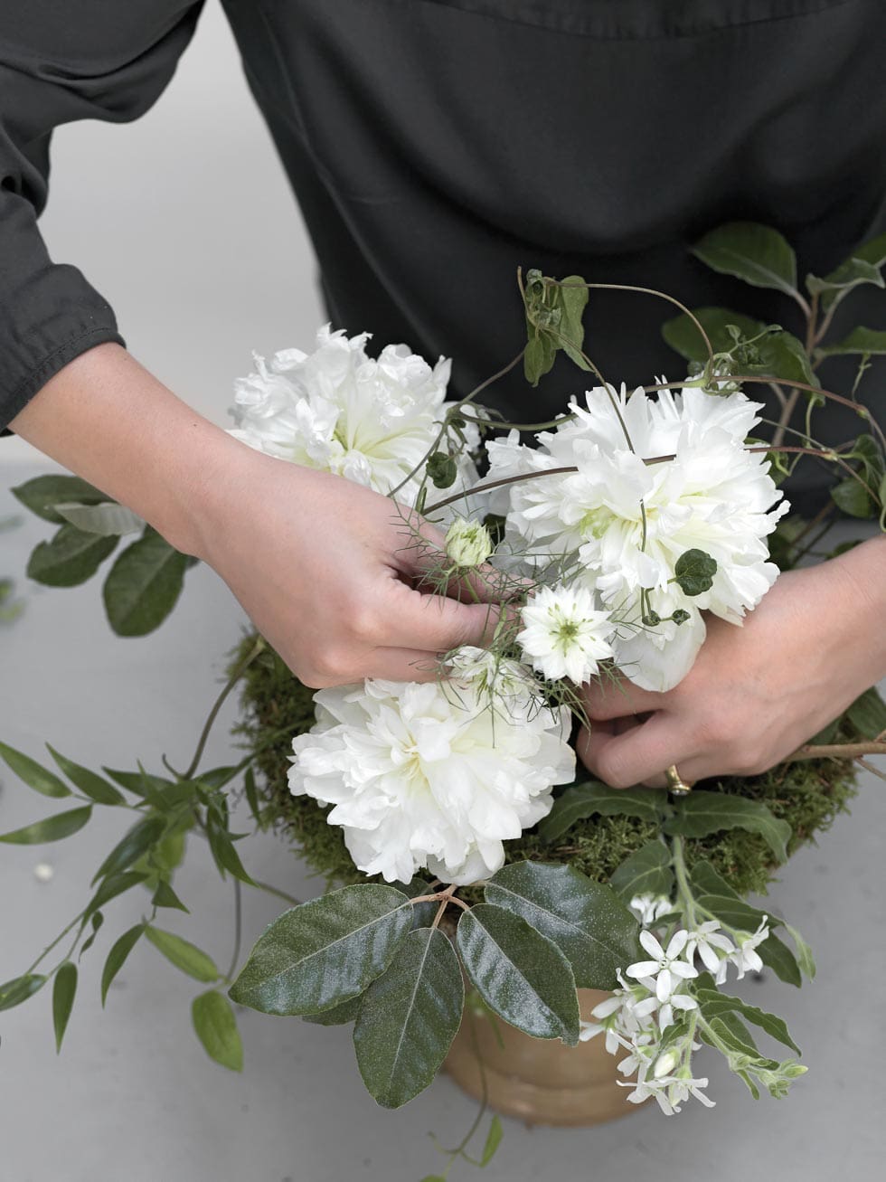 Als Nächstes wird die Höhe des Arrangements zum Beispiel mit Ranken, feinem Blattwerk oder zarten Blüten definiert.