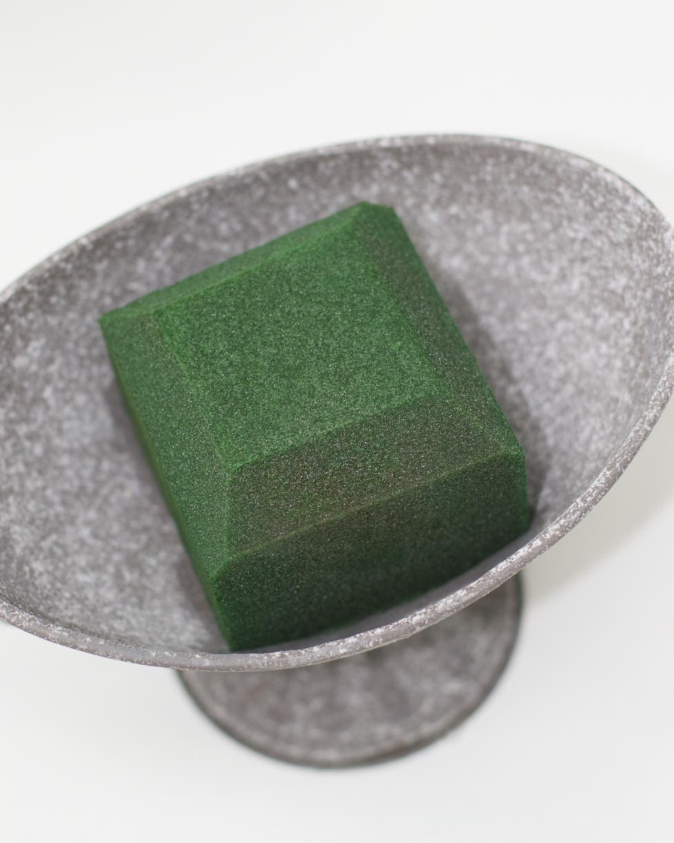 Schneidet euch die benötigte Größe Steckmasse zurecht und füllt euer Küchen-Waschbecken mit Wasser. Legt die Steckmasse auf die Wasseroberfläche und lasst sie eigenständig das Wasser aufnehmen. Das dauert nur ein paar Sekunden. Auf keinen Fall die Steckmasse unter Wasser drücken, da sich dann ein trockener Kern bilden würde.