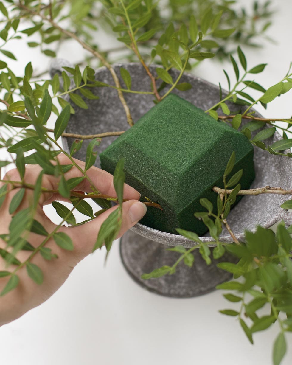 Beginnt euer Gesteck mit ein paar Zweigen, die herabfließend in den Rand der Steckmasse gesteckt werden. Hierfür kürzt ihr die Stiele auf die gewünschte Länge und steckt sie mindestens zwei Zentimeter in die Steckmasse. Das ist die beste Basis für euer Gesteck.