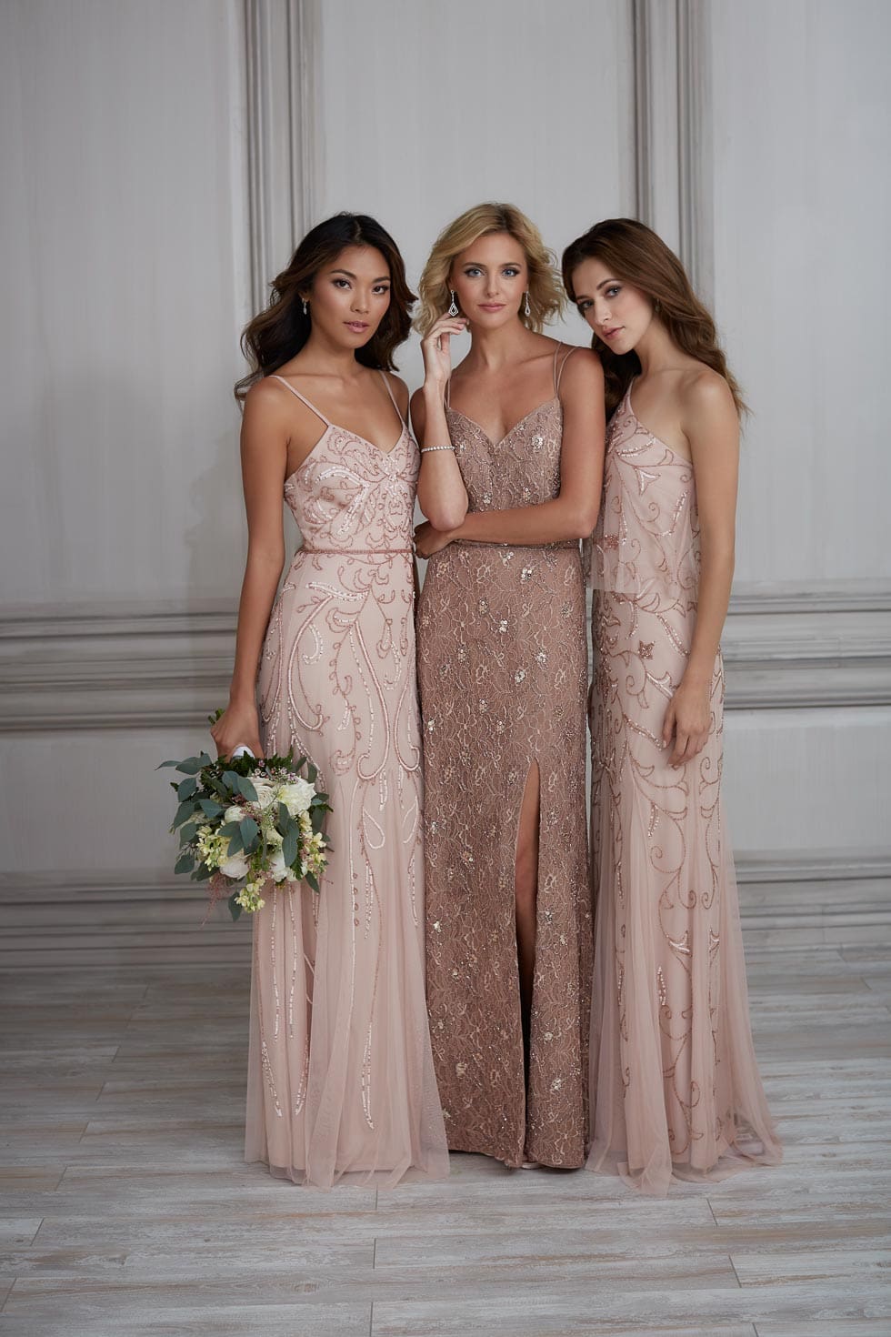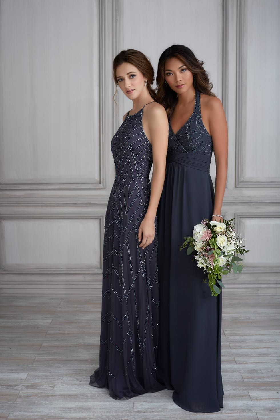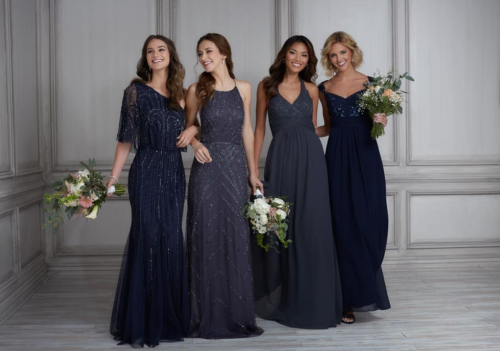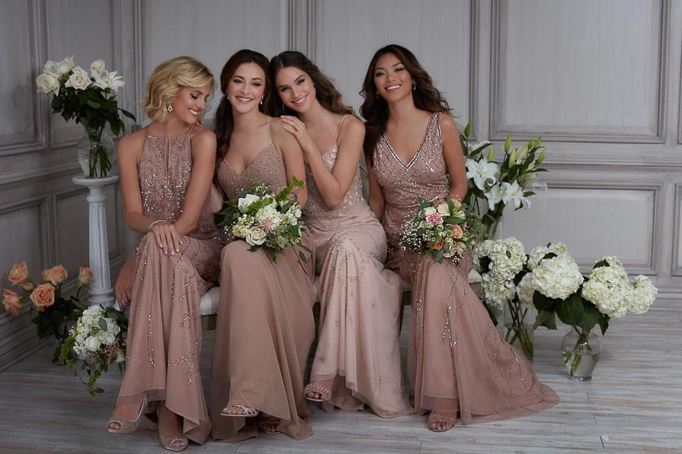Besonders schön ist es auch, die Brautjungfernkleider in verschiedenen Farben aus eurem Hochzeitskonzept zu wählen. So könnt ihr beispielsweise auch drei Kleider in Blush und drei Kleider in Anthrazit miteinander kombinieren: