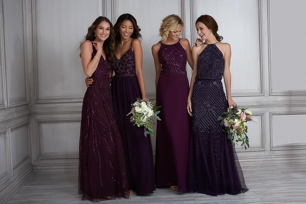 Eine schöne Idee ist es auch, die Brautjungfernkleider aus einer Farbfamilie auszusuchen und beispielsweise Aubergine mit Beerentönen in verschiedenen Helligkeiten oder Graublau und Grau zu mischen: