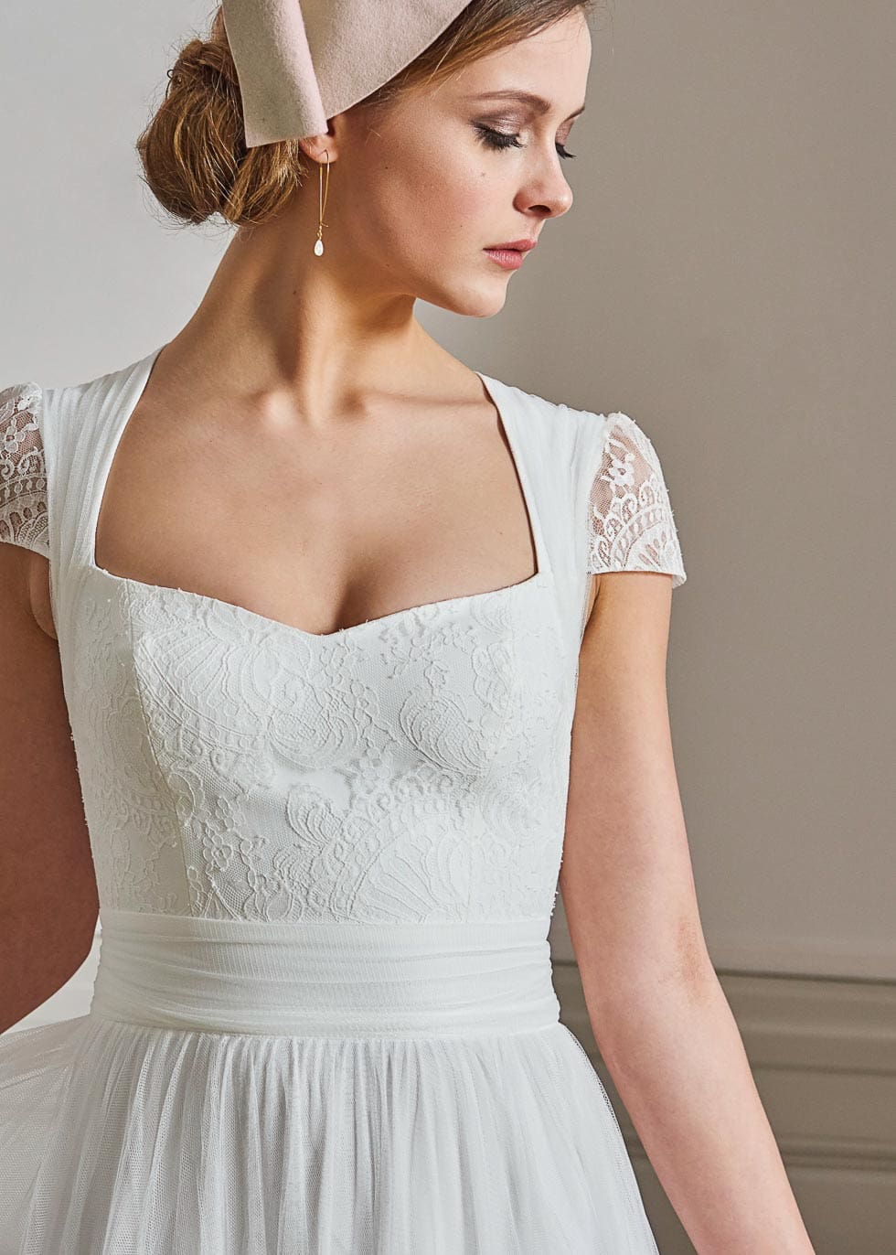 Dieser Brautkleid Ausschnitt erinnert an die großen Roben der 50er Jahre.