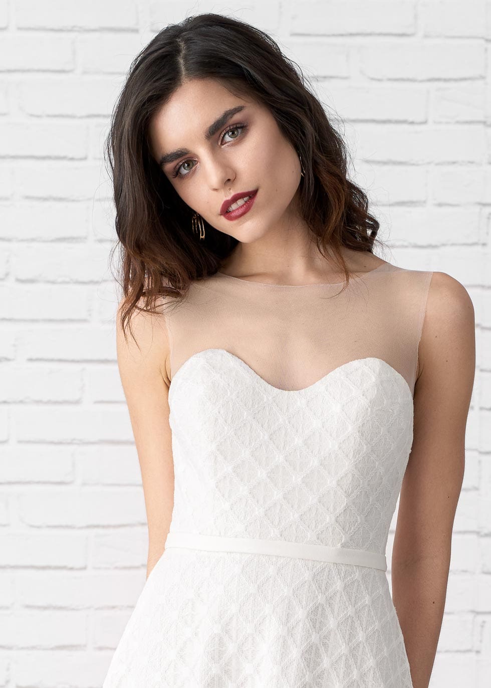 Bei diesem Brautkleid Ausschnitt wird das Oberteil durch transparenten oder durchscheinenden Stoff wie Tüll, Organza oder – derzeit besonders beliebt – Spitze ergänzt.