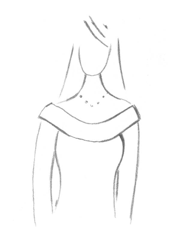 Der Carmen Ausschnitt sitzt unter den Schultern, um das Schlüsselbein herum. Dadurch sind die Schultern unbedeckt. Zudem hat er breite Träger, die einen Teil des Oberarmes bedecken.