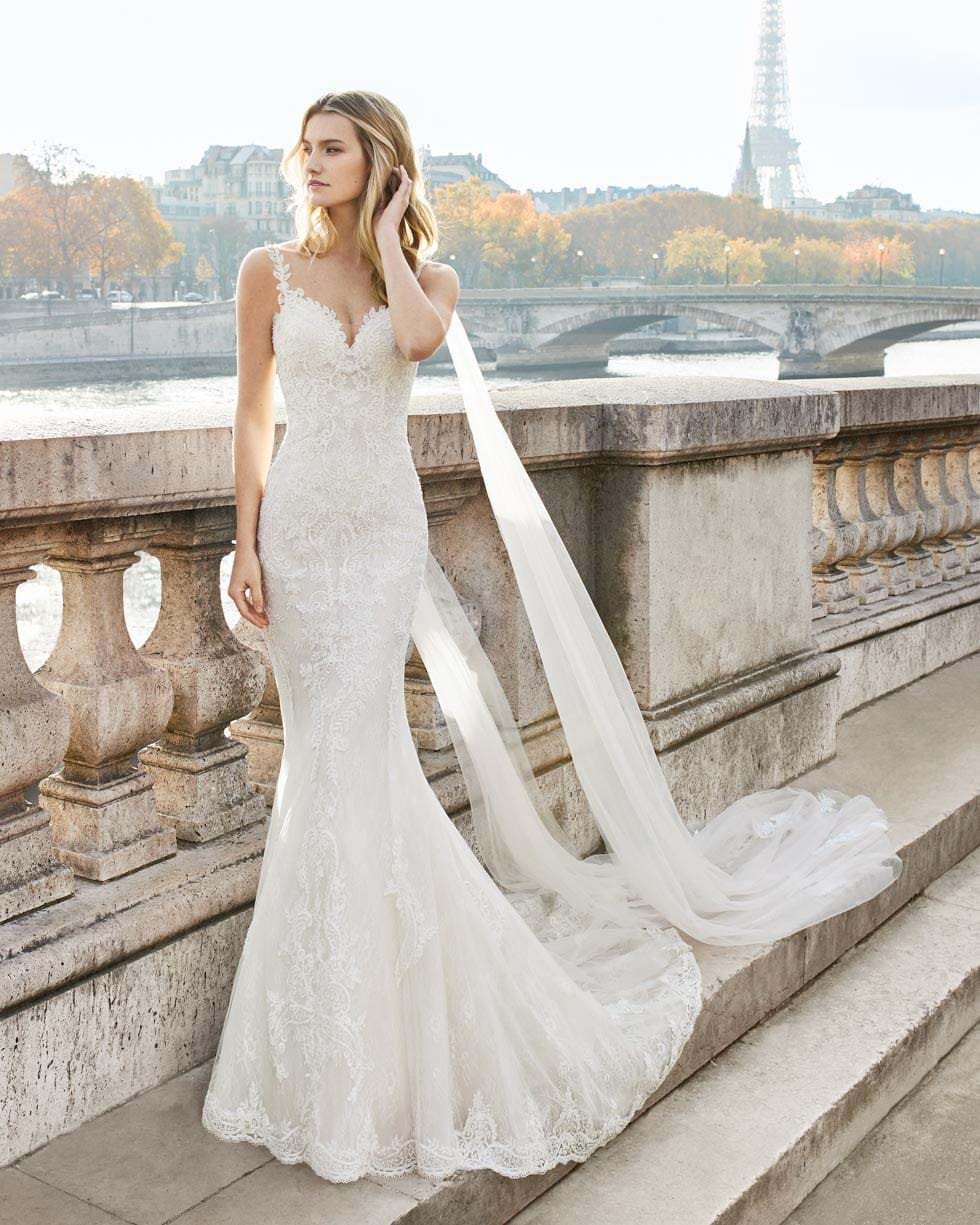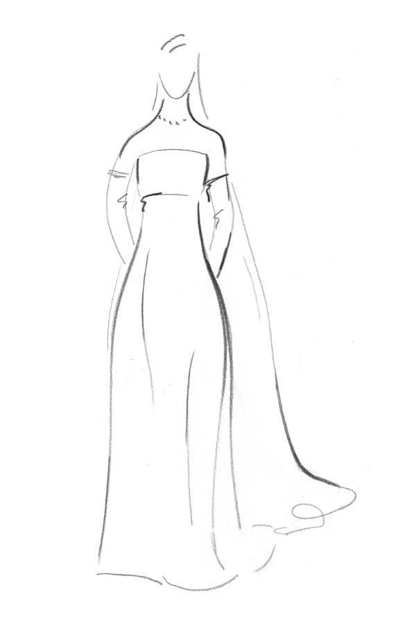 Wegen seines unglaublich weichen Falls mit unsichtbarer Taille betont der schmale Schnitt den Oberkörper und die Hüften. Dabei liegt er eng am Körper an und ist gerade geschnitten, ohne eine horizontale Taillennaht zu besitzen. Deshalb eignet sich diese Brautkleid Form vor allem für die zierliche Braut. Und dennoch kann dieser Schnitt aber auch von femininen Silhouetten selbstbewusst getragen werden.