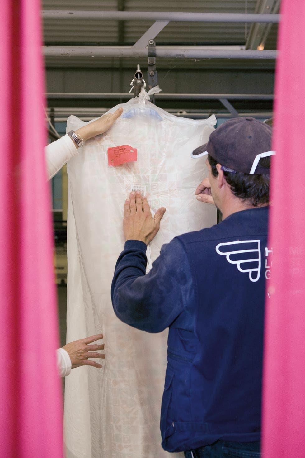 Wenn die Waschmaschine mit ihrer Arbeit fertig ist, wird das Kleid aufgehängt und an der Luft getrocknet. Wer jetzt allerdings meint, das Kleid sei bereits fertig für den Rückversand, hat weit gefehlt.