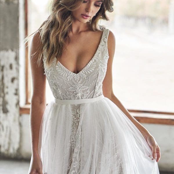 Bei der Tattoo Spitze handelt es sich um unglaublich feine Spitzenapplikationen, die aussehen, als säßen sie auf der Haut der Braut. Für diese Transparenz sorgt der weiche Tüll, der auf der Spitze in der Regel aufgenäht wird.
