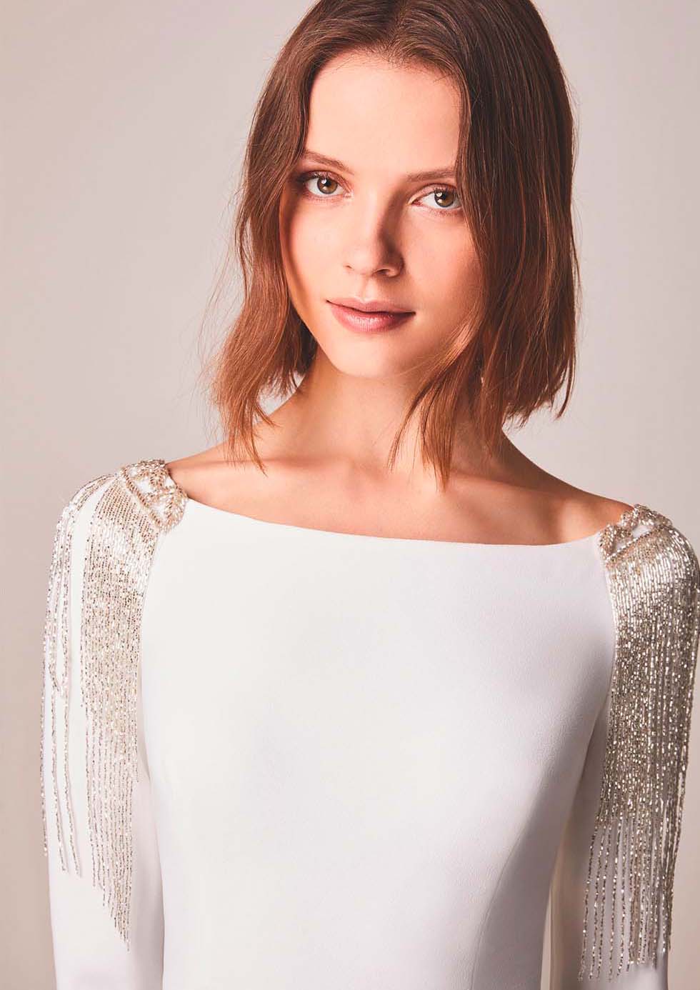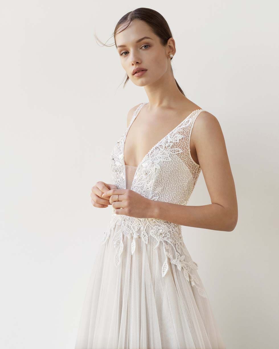 Dabei sind der Fantasie keine Grenzen gesetzt: Von floralen bis geometrischen Mustern kann die Perlenstickerei auf unterschiedlichsten Brautkleidstoffen eingesetzt werden.