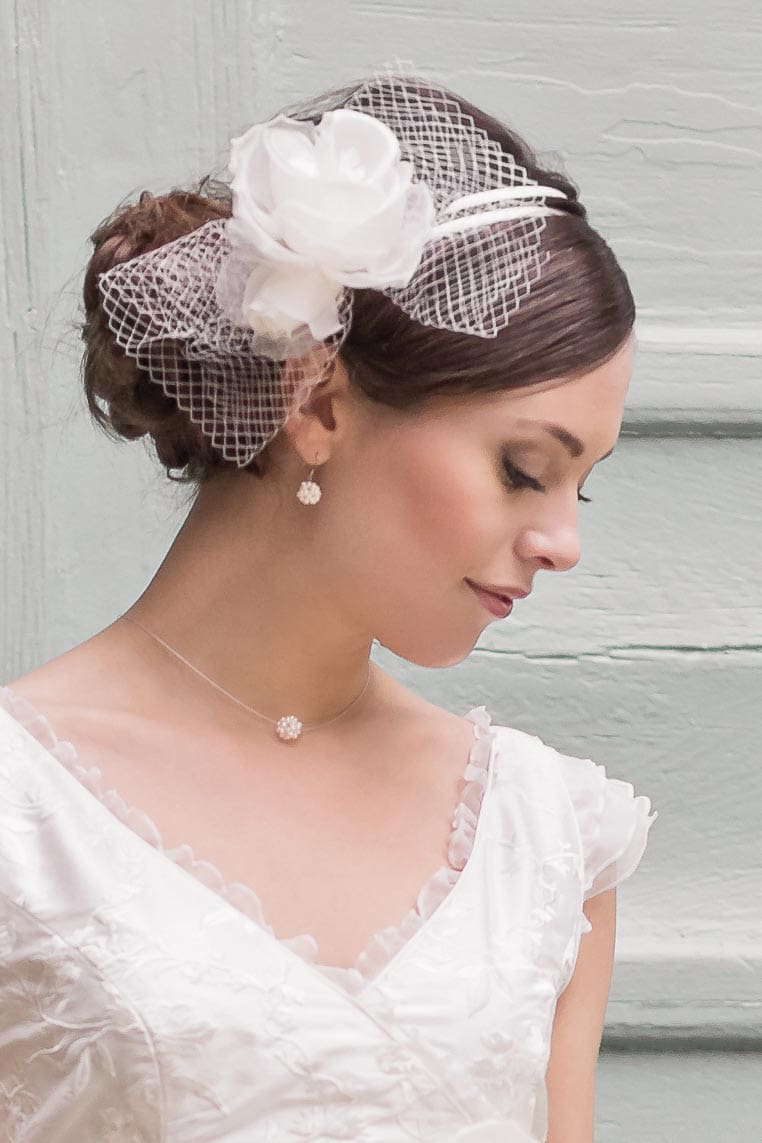 Häufig wird er mit einem Fascinator kombiniert und kann sowohl vorne als auch seitlich am Kopf getragen werden. So zaubert er auch direkt einen charmanten Vintage-Look.