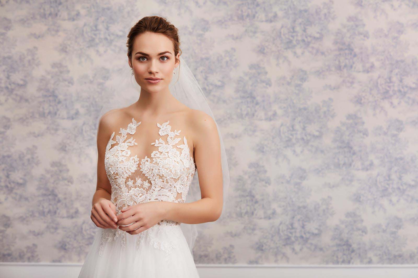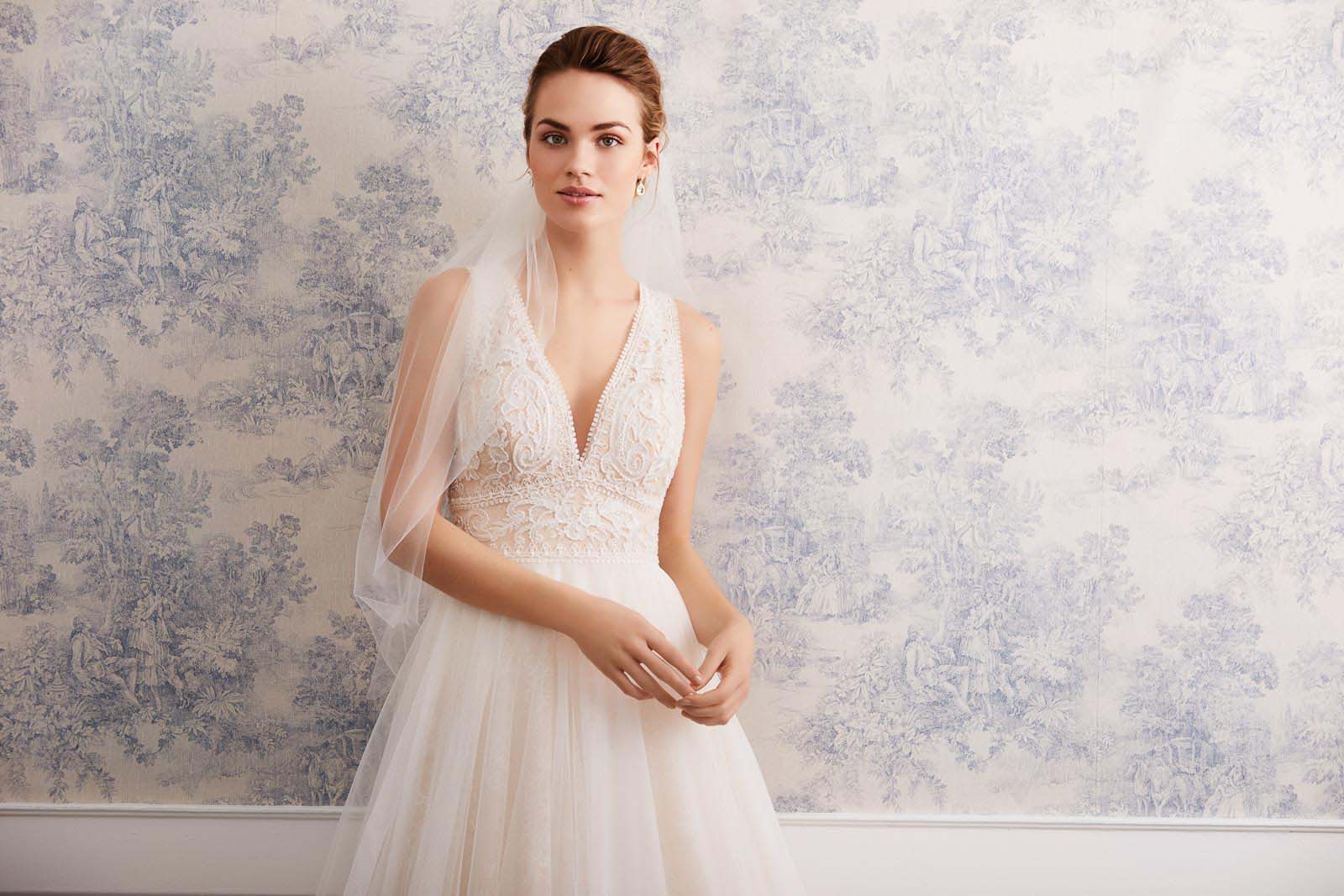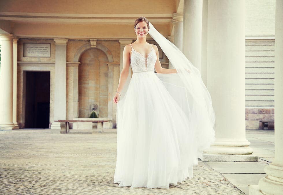 Deshalb passt der Schleier auch besonders gut zu Brautkleidern, die bezaubernde Brust- oder Hüftdetails haben, da er diese Highlights des Hochzeitskleides nicht verdeckt.