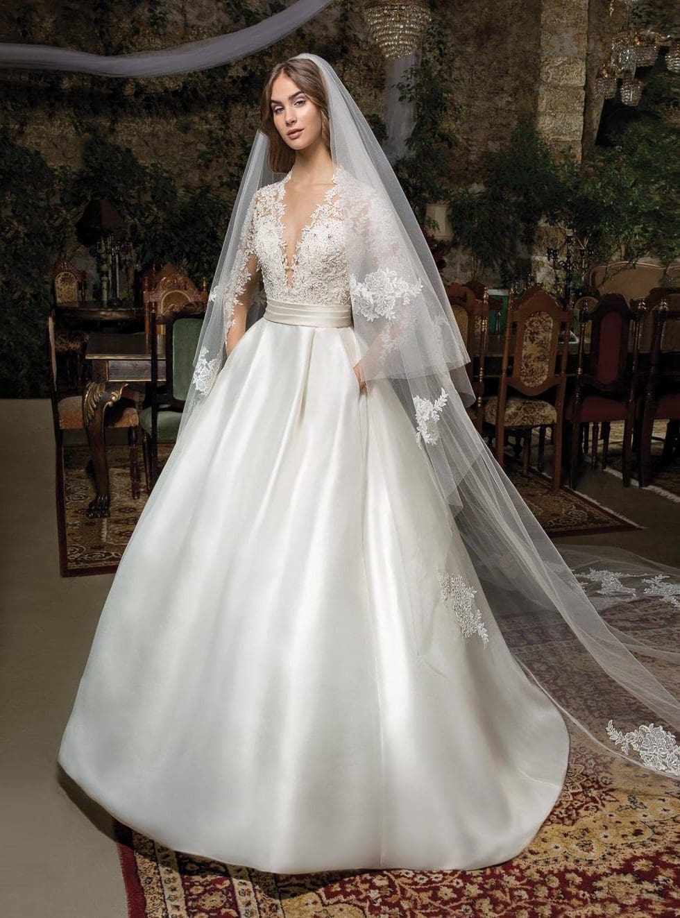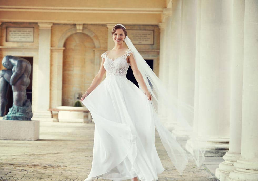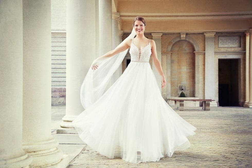 Zudem fällt ein Brautschleier mit Satinsaum in großen, leicht geschwungenen Falten an euch herab. Schaut euch an was wir damit meinen: