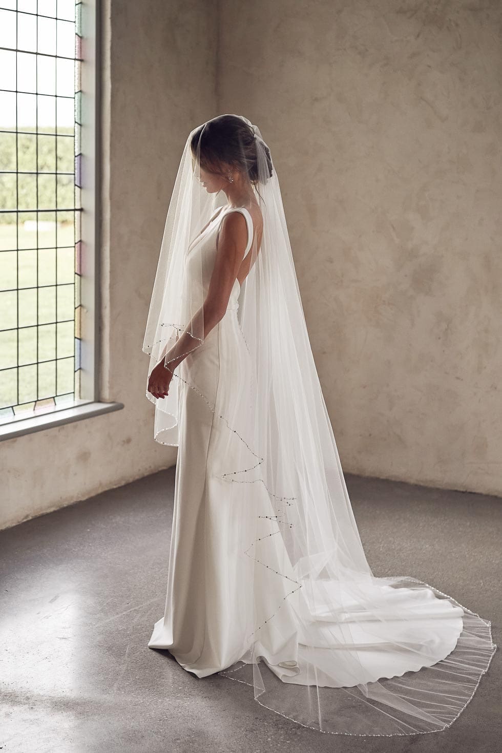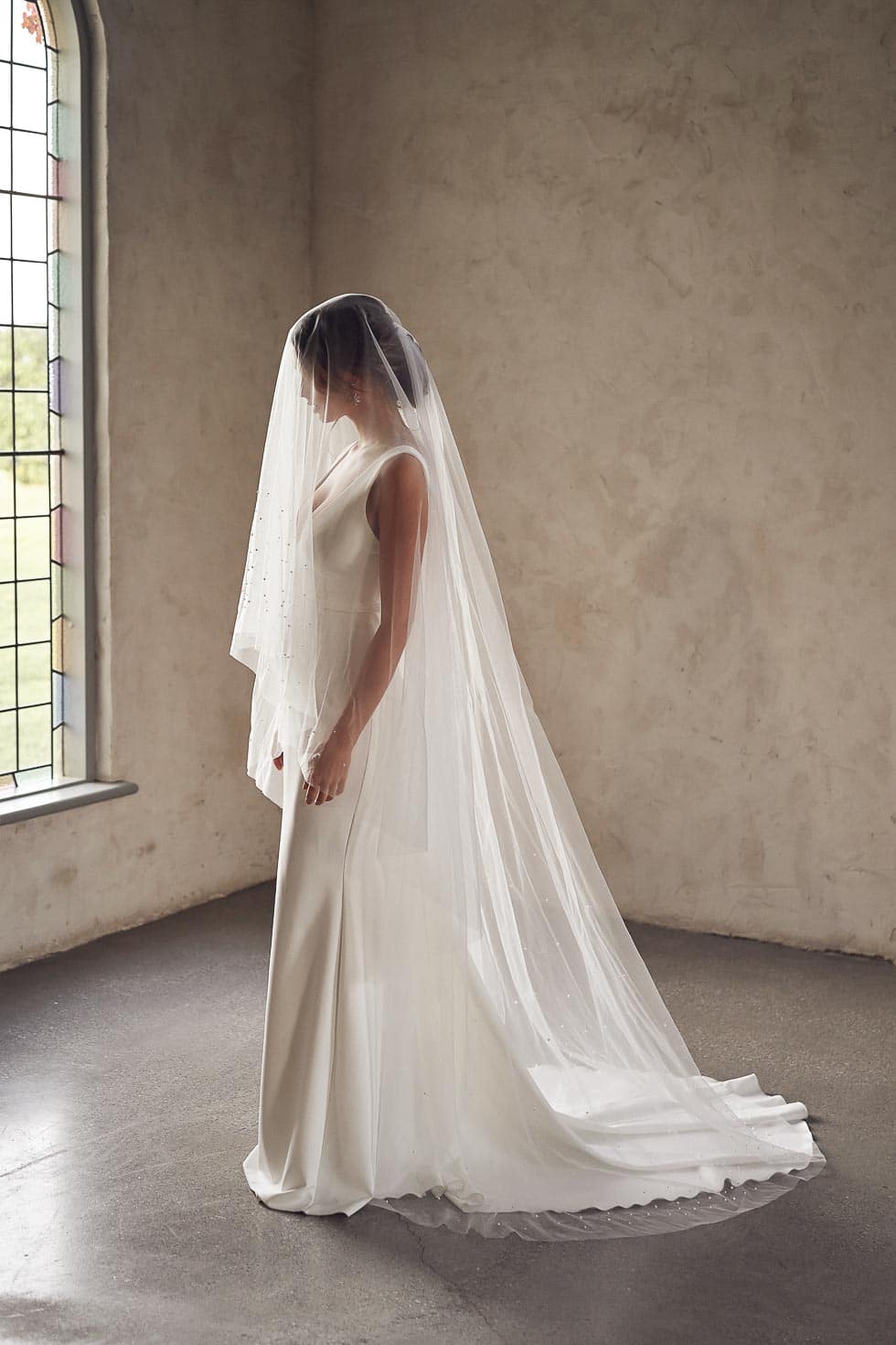 Der formelle Kirchenschleier endet am Boden und wird meist mit einem Blusher Schleier und einer Schleppe am Brautkleid kombiniert.