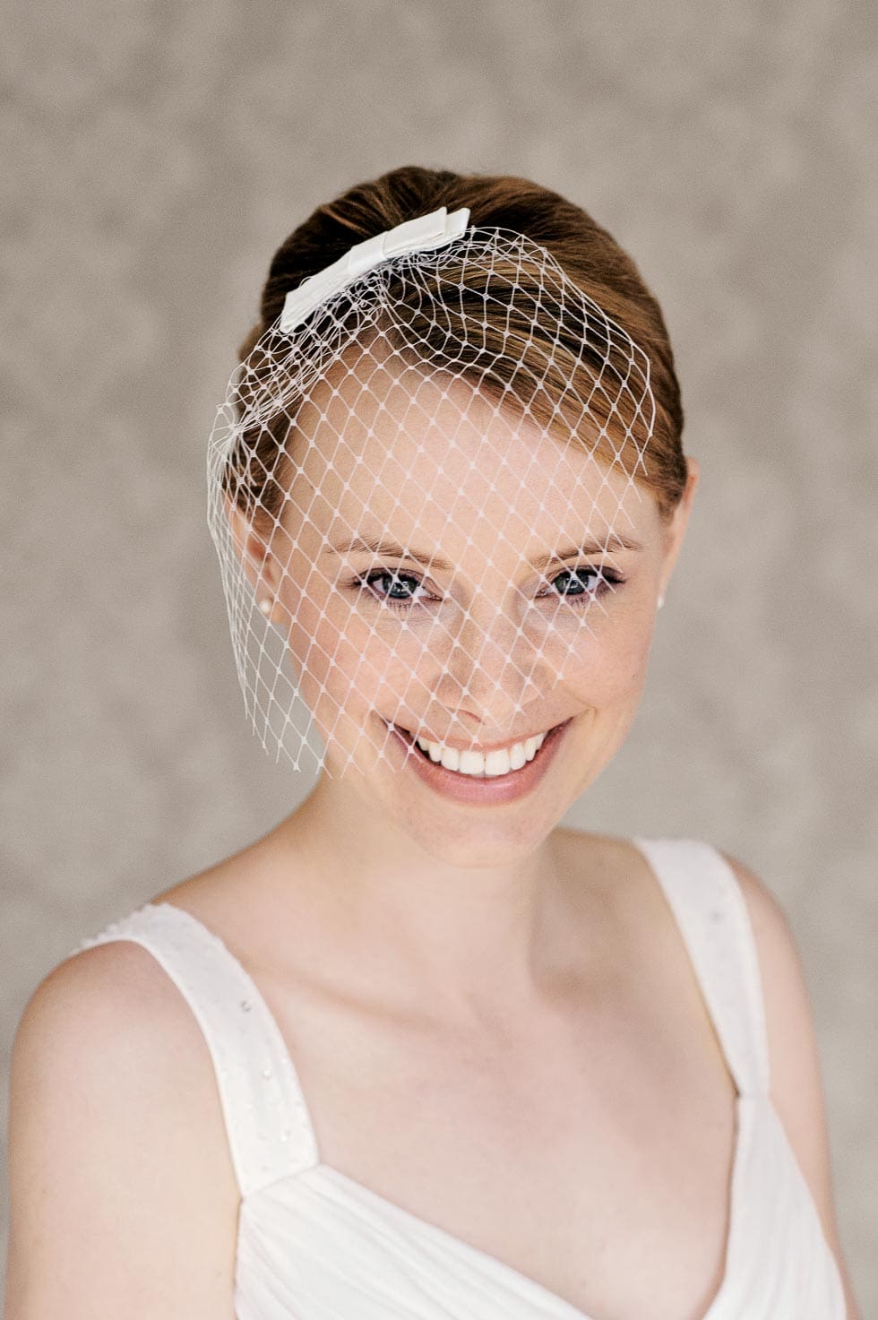 Bei einem Birdcage Schleier verläuft der Tüll vom Blütengesteck aus seitlich über eine Gesichtshälfte.