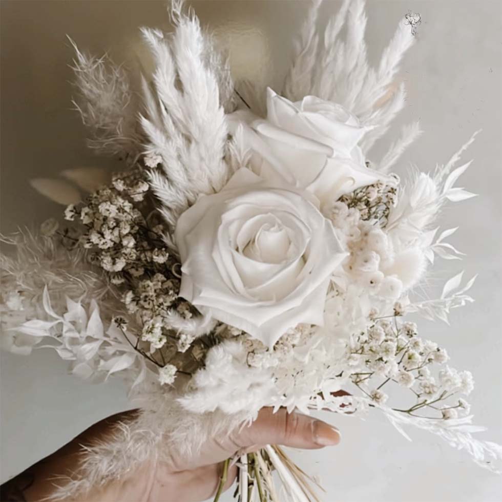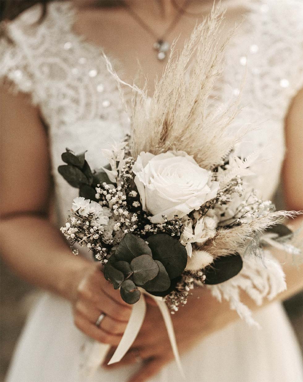 Weißer Boho Brautstrauß mit gebleichten Blüten