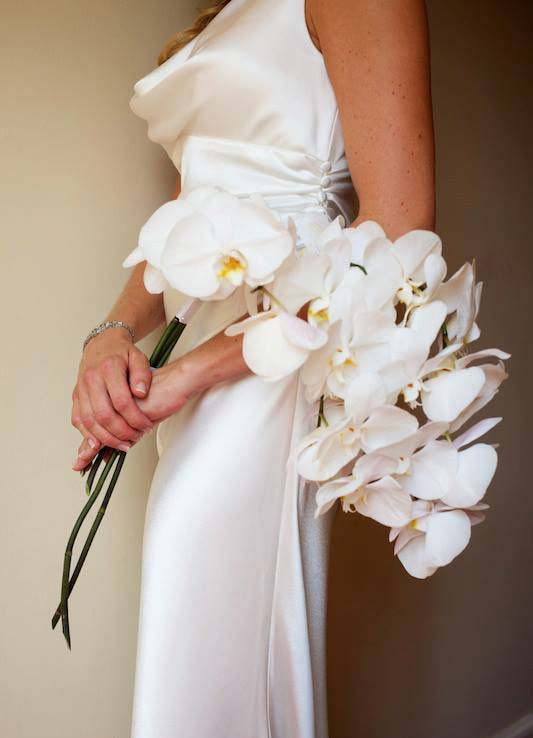 Besonders wundervoll wirken Tropfen-Brautsträuße zu schmal geschnittenen Brautkleidern und Hochzeitskleidern mit Schleppe.