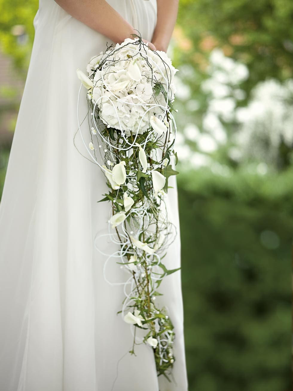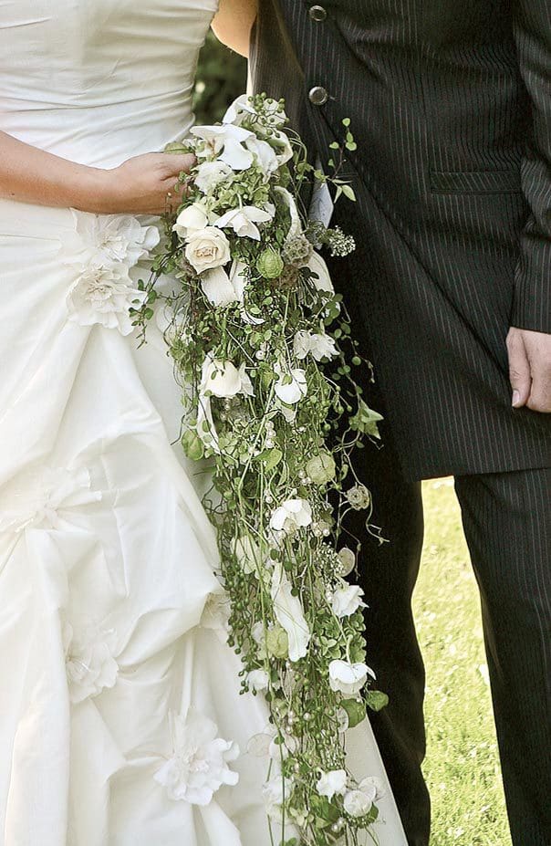 Die „fließenden“ Blüten und Blätter umspielen das Brautkleid sehr schön, weshalb der Wasserfall Brautstrauß für alle Brautkleidformen außer kurze Brautkleider geeignet ist.