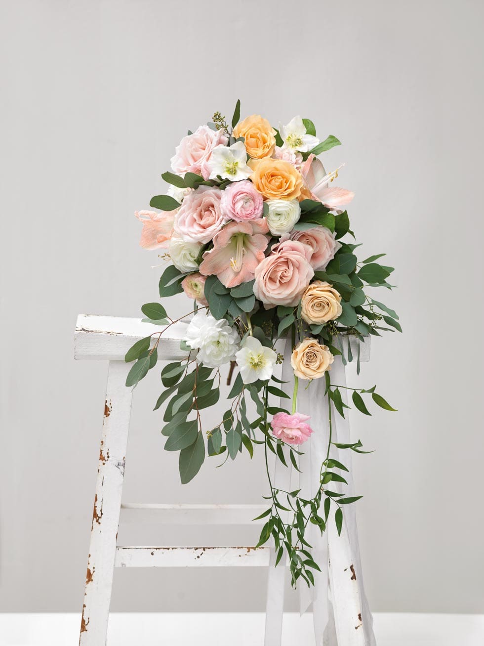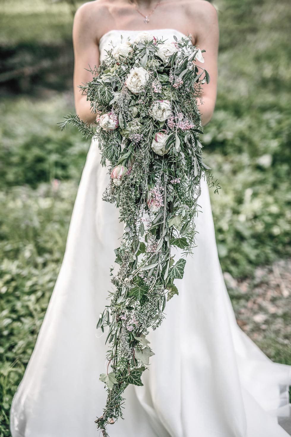 Ein Wasserfall-Brautstrauß ist ein rund gebundener Strauß, aus dem nach unten hin weitere Blüten, Blätter und Gräser abfließend arrangiert sind.