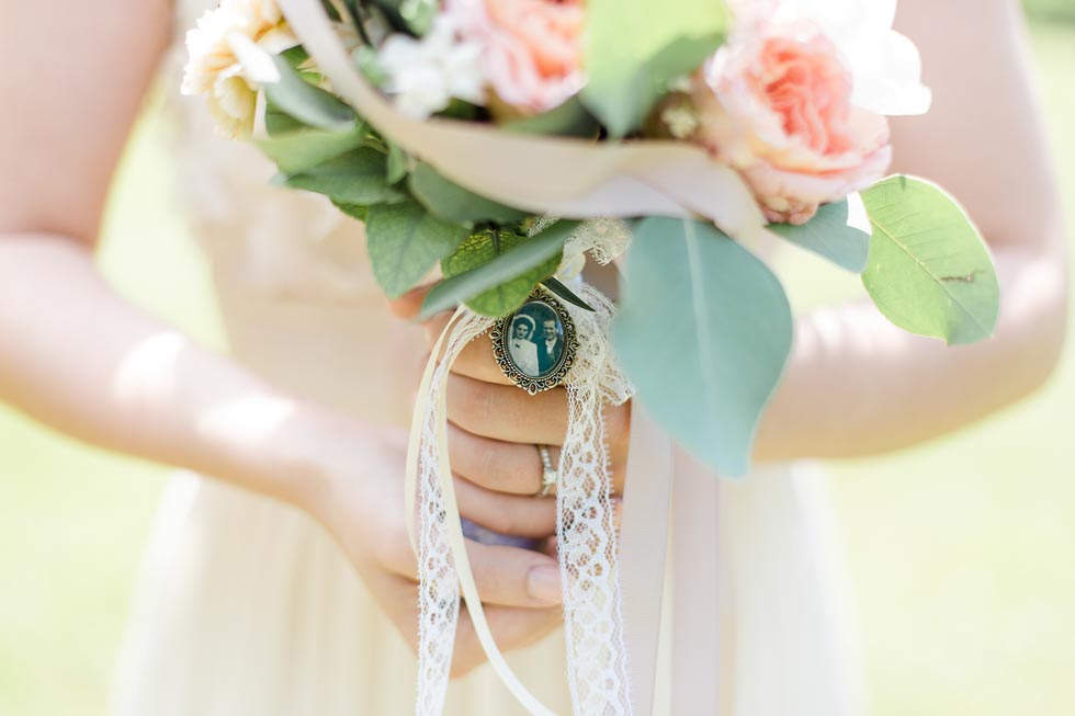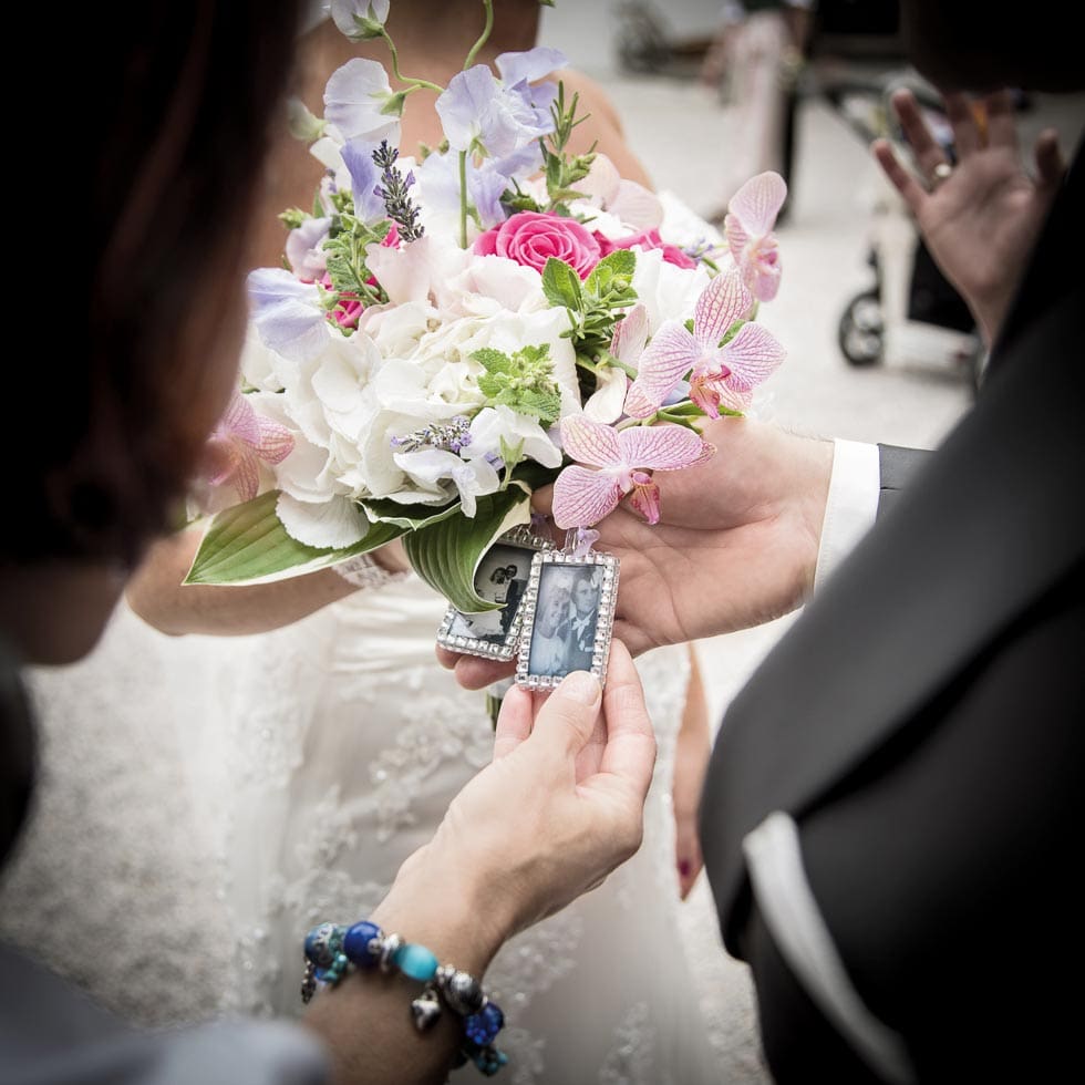 Gibt es einen lieben Menschen, der bei eurer Hochzeit nicht (mehr) dabei sein kann? Dann könnt ihr ein Bild in einem Foto-Anhänger* oder Foto-Medaillon* an eurem Brautstrauß befestigen, um ihn ganz nah bei euch zu haben.