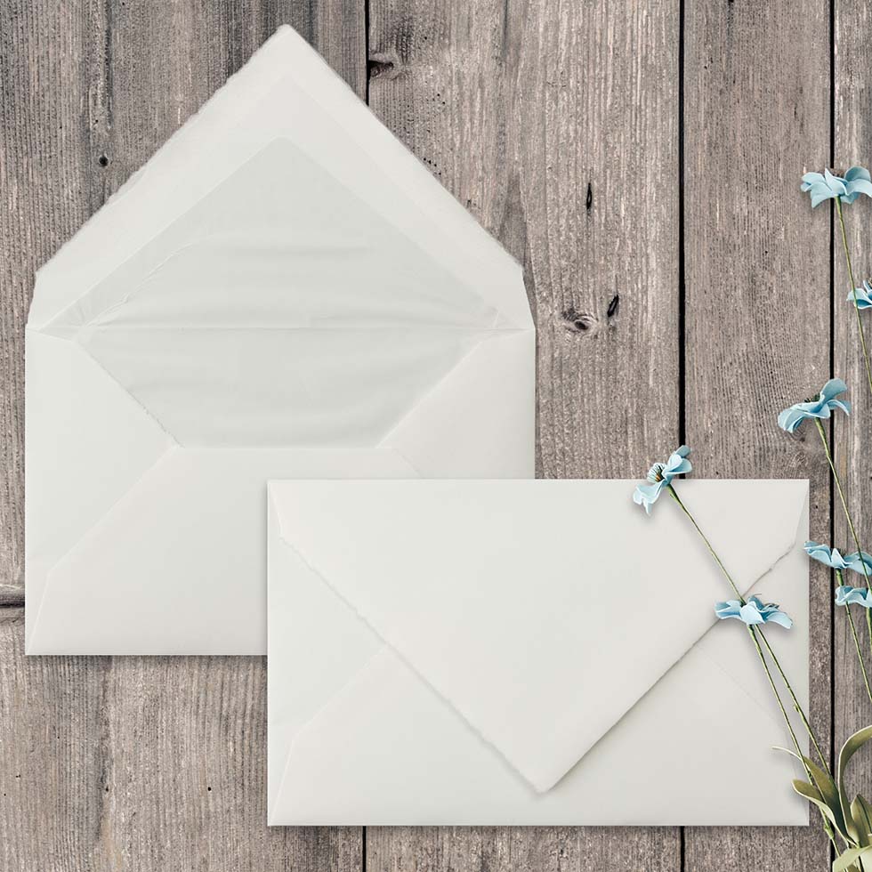 Man erkennt Büttenpapier-Briefumschläge an ihrem sehr charmanten ausgefransten Rand n der spitzen Klappe.